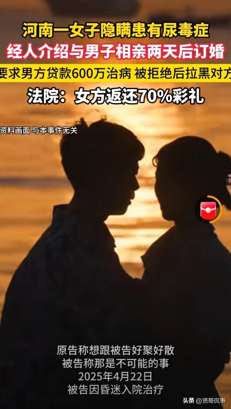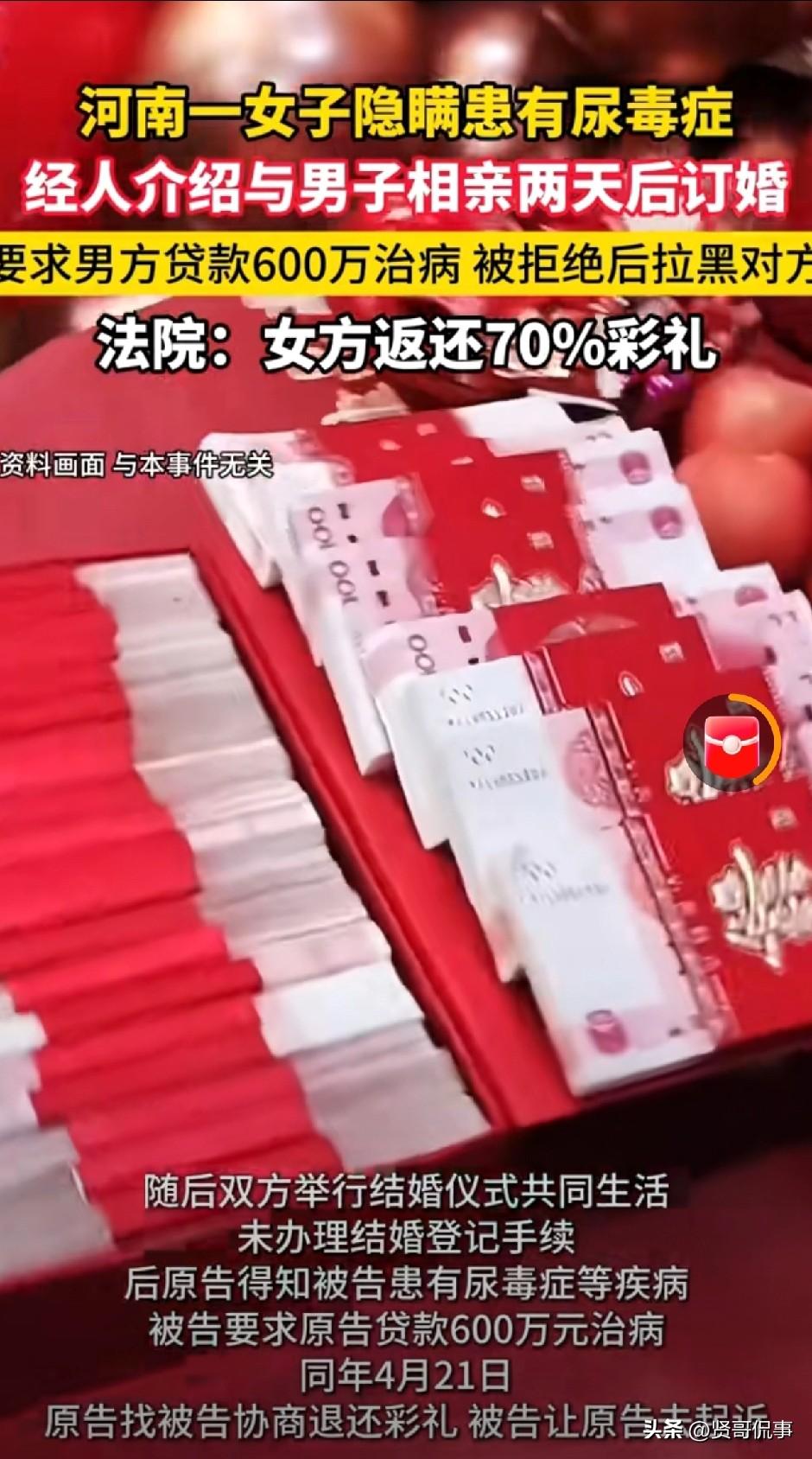 “林子大了什么鸟都有!”河南周口,男子相亲第3天,便拿出23.8万元和女方订婚。之后,两人又在未领证的情况下,举办了婚礼,并开始同居。怎料,同居期间,男子意外得知女方竟患有尿毒症,而自己和家人却一直被蒙在鼓里。更让男子崩溃的是,女方居然还提出让其贷款600万元为她治病。男子当然不愿,遂向女方提出好聚好散,要求返还彩礼,女方则态度强硬。男子无奈,只好起诉至法院。 这是裁判文书网公布的一则真实案件: 2025年1月5日,周先生经媒人介绍,认识了女子张某。 见面后,经过短暂的相处,双方觉得彼此还算合适,再加上家里催婚,没过多的犹豫,两天后,两人就按当地习俗订立了婚约。 订亲时,周先生按照老家的规矩,给了张某支付了188000元彩礼,又置办了三金,另外还给了50000元车款,前前后后加起来一共238000元。 这笔钱几乎掏空了他家里的全部积蓄。 之后,两人如期举办了结婚仪式,但从始至终都未领取结婚证。 在共同生活了一段时间后,周先生发现了一个让他无法接受的事实。 原来,张某患有尿毒症多年,而这件事,她从头到尾,只字未提。 更让周先生生气的是,即便拆穿了张某,张某不仅没有半点愧疚,反而得寸进尺,竟直接要求周先生去贷款600万元给她治病。 周先生当即就拒绝了,他无法接受张某的欺骗,更觉得张某并不是他理想中的妻子。 于是,周先生同张某表达了要分开的想法,希望张某能返还彩礼,两人好聚好散。 可张某态度却十分强硬,直接一口回绝,还表示想好聚好散不可能,想要彩礼就让周先生自己去法院起诉。 周先生无奈,只能诉至法院要求张某退还彩礼。 此事也引起了网友的热议: 有人说,发生这样的事,根源在于一切都太仓促了,男方在没有摸清楚女方底细的情况下,就匆匆订婚,可不就会踩坑。 也有网友表示,张某隐瞒疾病的行为更过分,这不是摆明了给男方当猴耍嘛! 那么,发生这样的事,从法律角度来看,又如何评价呢? 1、周先生和张某从来都没有婚姻关系,两人顶多算作同居。 《民法典》第1049条:只有男女双方来到婚姻登记机关,完成结婚登记,才正式确立婚姻关系。 而周先生和张某只办了仪式、同居,但尚未领取结婚证,根本就算不上是法律意义上的夫妻 。 2、张某隐瞒重大疾病,违背了婚约最基本的诚信。 《民法典》1053条明确规定,一方患有重大疾病的,应当在结婚登记前如实告知另一方。 而尿毒症及糖尿病,无疑就属于重大疾病,婚前必须如实告知。 而张某在收完23.8万彩礼、共同生活后仍藏着掖着,明显是故意隐瞒,违背了诚信原则。 3、张某和周先生不是夫妻,周先生当然也没有法定的扶养义务。 她要求周先生贷款600万治病,没有任何法律依据,本质上来讲,是她把周先生当成了“提款机”! 4、周先生当然可以要求张某返还彩礼。 彩礼的本质是一种以结婚为条件的赠与。而今,两人的婚姻不成立,彩礼自然应予以返还。 而根据最高人民法院《关于审理涉彩礼纠纷案件适用法律若干问题的规定》: 双方未办理结婚登记但已共同生活,一方请求返还按照习俗给付的彩礼的,人民法院应当根据彩礼实际使用及嫁妆情况,综合考虑共同生活及孕育情况、双方过错等事实,结合当地习俗,确定返还的具体比例 。 鉴于张某和周先生共同生活过一段时间,且女方身患重病、经济能力弱。 法院最终酌情判决由张某返还70%的彩礼,即166000元。 其实,周先生的例子很典型,短暂的相处,就认定了对方是一辈子的“枕边人”,殊不知,这其中埋着诸多隐患。 到头来,种种付出沦为一场空,伤钱又伤感情。 对此,你怎么看呢?欢迎大家在评论区留言。