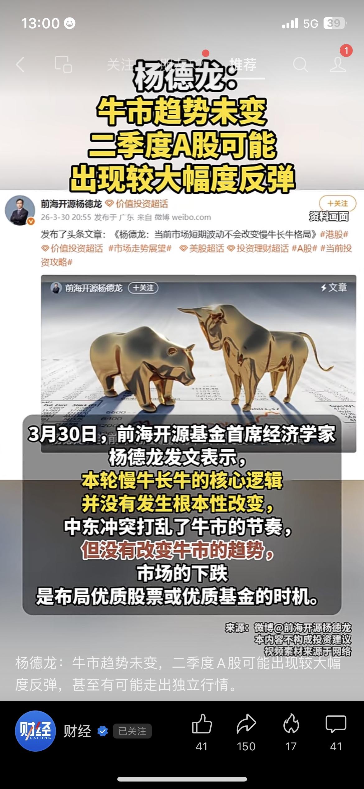 分析师杨德龙明确预判:二季度A股大概率迎来较大反弹,重点看好科技龙头与绩优蓝筹。 当前市场情绪回暖,资金与政策面都在逐步发力。 普通人别追涨杀跌,拿住优质标的、控制好仓位,耐心等待轮动就行。 不构成投资建议,理性看待行情。 市场有风险,投资需谨慎。 A股 股市