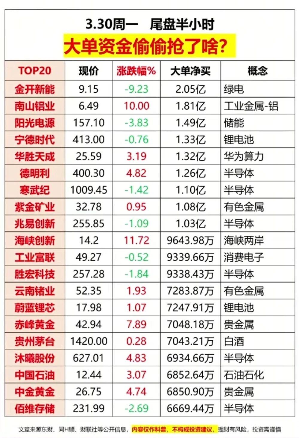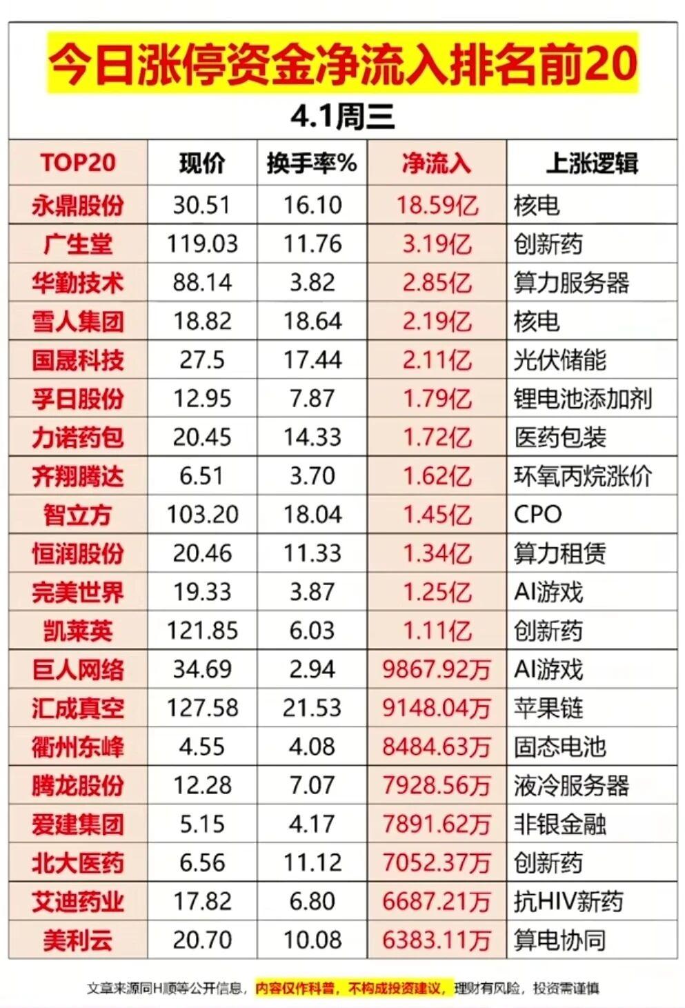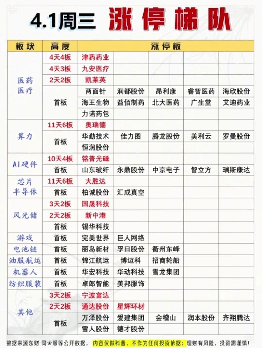 4.1周三A股复盘|医药主线爆发,算力+新能源多点开花 今日A股全线走强,沪指大涨1.46%,两市成交超2万亿,4495家个股飘红,赚钱效应拉满!医药医疗成绝对主线,津药药业4连板,凯莱英2连板,创新药、CRO、原料药批量涨停,资金深度抱团;算力、AI硬件持续活跃,奥瑞德、大胜达走出长牛趋势,铭普光磁10天4板;风光储、油运、机器人等赛道多点开花,65家个股涨停,市场情绪全面回暖。 游资大佬们动作频频:章盟主加仓雪人集团、电光科技,成都系大手笔扫货雪人集团1.01亿,拉萨家人们全面布局医药、算力、新能源多赛道;主力资金则重仓中际旭创、兆易创新等CPO/存储芯片龙头,永鼎股份以18.59亿净流入登顶涨停榜,创新药、绿电、算力成资金核心进攻方向。 创新药迎来史诗级利好,政策+出海+研发三重催化,新主线信号明确,后续细分方向持续发酵。市场风格全面扩散,主线清晰、热点轮动,把握结构性机会的同时,务必注意追高风险,理性投资! ⚠️ 内容仅做市场科普,不构成任何投资建议,理财有风险,投资需谨慎。