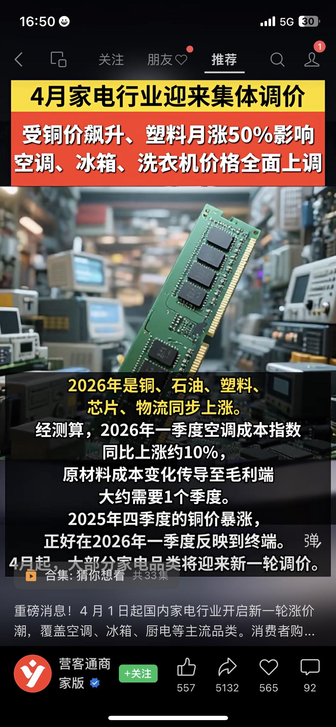 铜价季度暴涨33%,塑料价格月涨超50%,原材料成本彻底压不住了。 业内已经确认:4月起空调、冰箱、洗衣机将集体涨价,成本全部转给消费者。 刚需家庭真的别等,趁现在促销抓紧入手,能省几百是几百。 你家最近要换家电吗? 家电涨价 民生