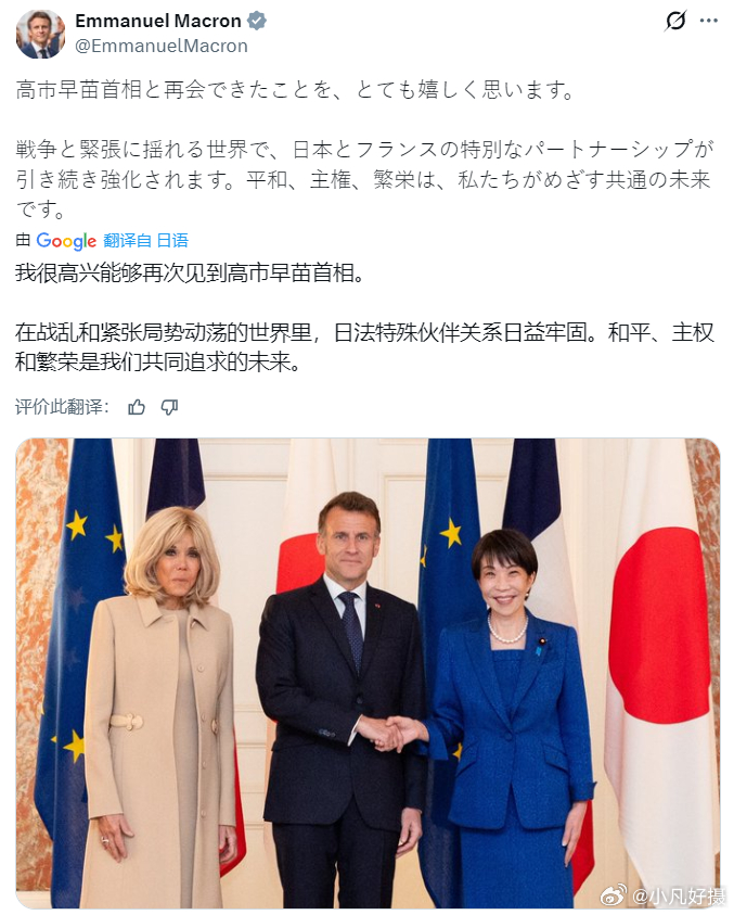 马克龙用日文发帖:“在战乱和紧张局势动荡的世界里,日法特殊伙伴关系日益牢固。和平、主权和繁荣是我们共同追求的未来。”补充:什么是主权?法国不知道高市早苗曾公开支持“台湾有事即是日本有事”?当然时局随时在变,法国人应该也不傻。日本彻底撕下伪装黄媒不会说的真相