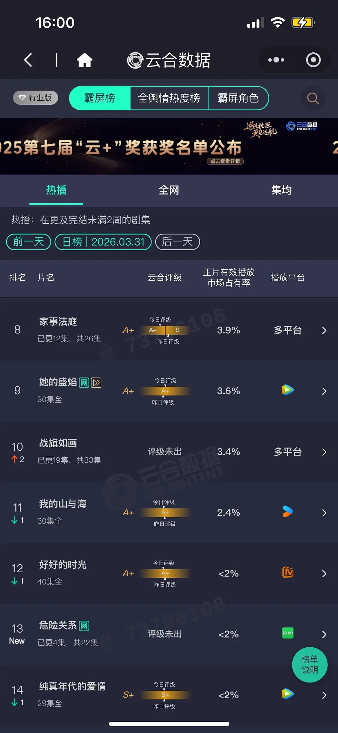 白日提灯 第三天就完全横盘,2万8热度都难,集均1500-1800危险关系,首日云合200+酷云300+低开,宣发不行,都没看到这剧投流,看今天热度走势也不太行,有看的不?能发笑么?家事法庭 我看了两集拍得还行还挺自然的,双平台播成这样扑是真扑,粉丝可以吹小众口碑剧