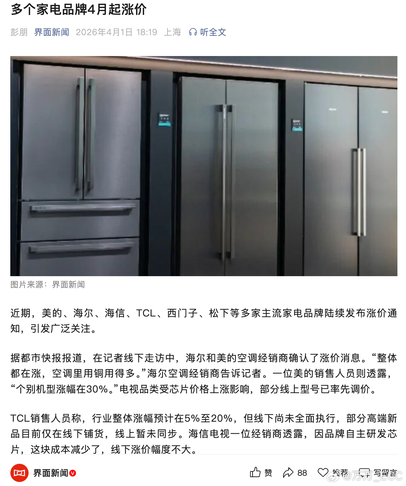 4月开始,受到原材料和芯片价格影响,家电涨价、两轮电动涨价。