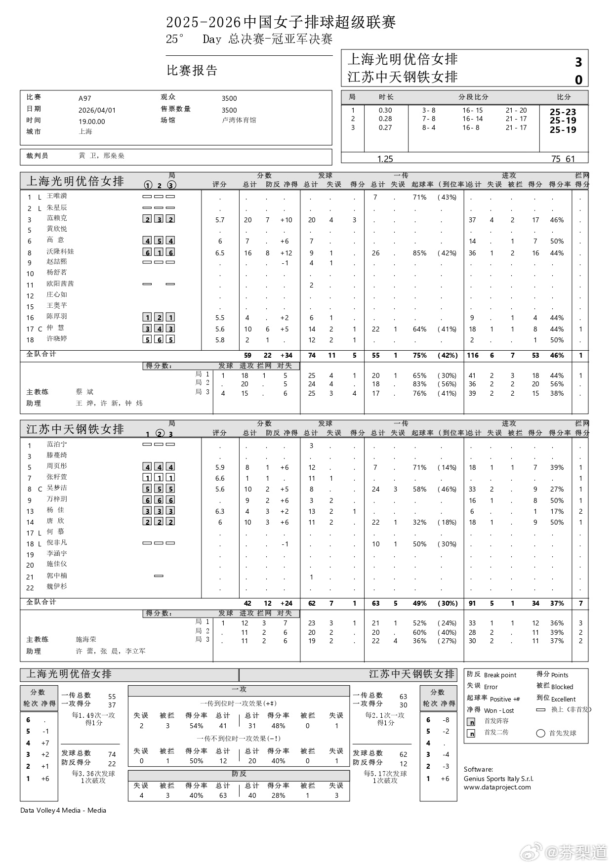 上海女排夺冠上海光明优倍女排决赛第三场:上海女排3-0江苏女排 上海队-江苏队进攻:53-34;拦网:1-7;发球:5-1;自失:16-19范赖克20分 37扣17中 6失误被拦 3发;沃隆科娃16分 36扣16中 3失误被拦;仲慧10分 18扣8中 2失误被拦 1拦1发;高意7分 14扣7中 1失误被拦;陈厚羽4分 9扣4中 1失误被拦;许晓婷2分 2扣1中 1发唐欣10分 18扣9中 1失误被拦 1拦;吴梦洁10分 33扣9中 2失误被拦 1拦;万梓玥9分 16扣8中 1失误被拦 1拦;周页彤8分 18扣7中 2失误被拦 1拦;杨佳4分 6扣1中 2拦1发;张籽萱1分 1拦