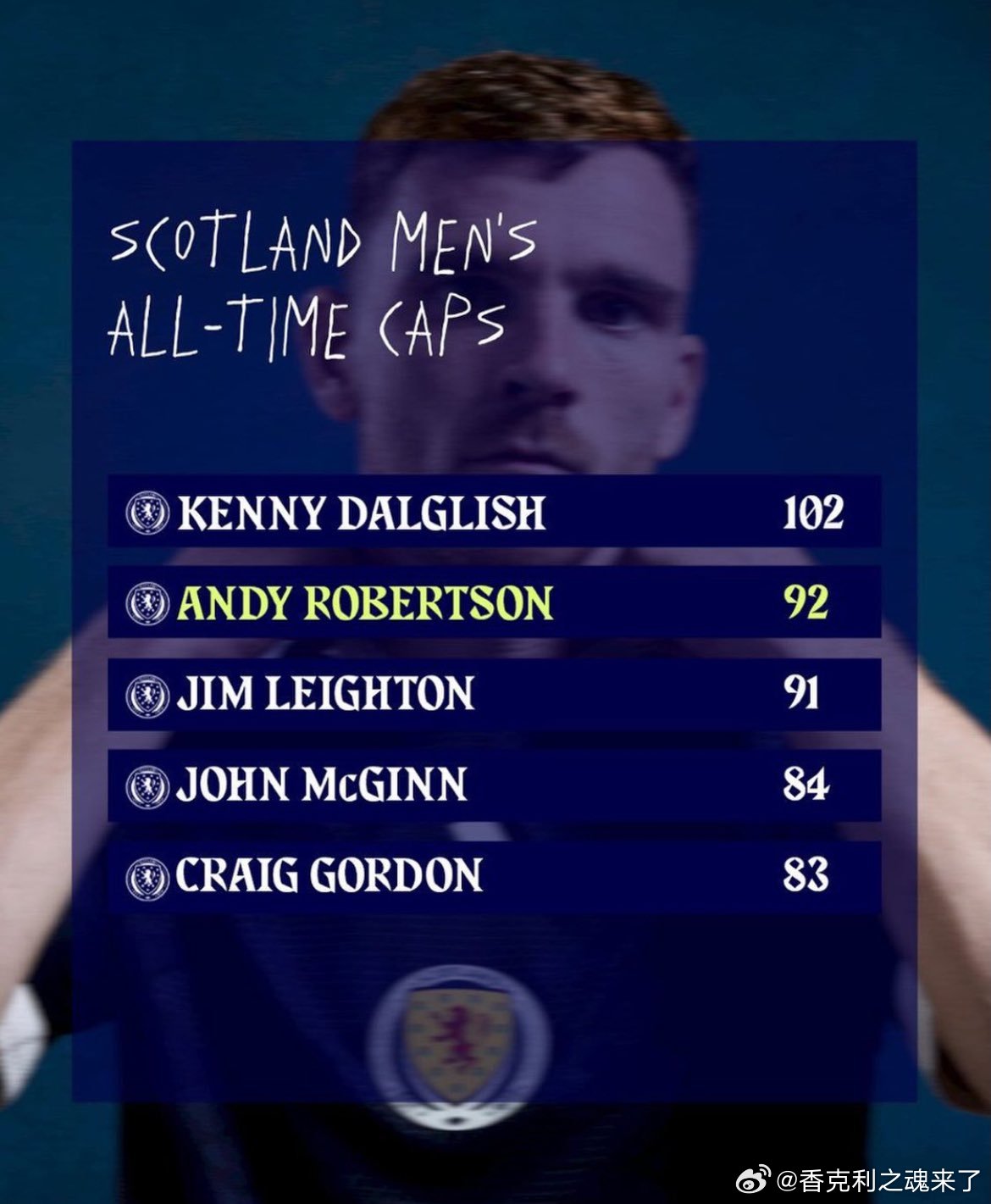罗伯逊的出场次数升至苏格兰队史第二,身前只剩肯尼·达格利什爵士一人 利物浦