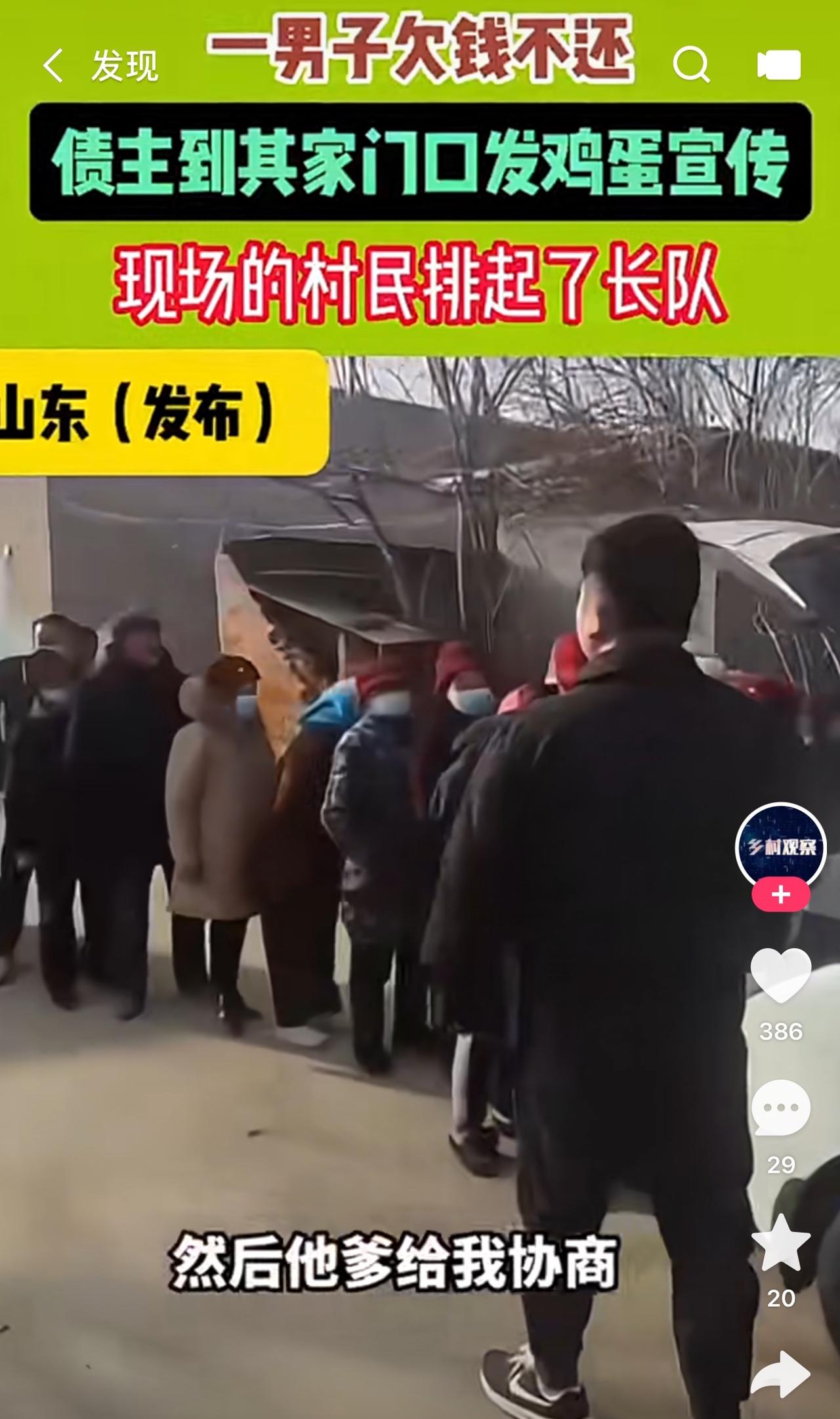 “这才是要债的最佳方式”,一男子欠债不还,债主直接到他家门口免费给村民发鸡蛋,宣传事情的来龙去脉以及男子的所作所为。 债主打开后备箱露出满满的鸡蛋,本村村民大爷大妈们迅速地排起了长队等着领鸡蛋,债主打开大喇叭宣传:本村王某某欠债不还,许了日期还钱,最后没还还直接拉黑了联系方式。 相信不出两小时全村都知道了,村民们的指指点点这谁受得了,就这要是再不还钱,在村里真是没法做人了。