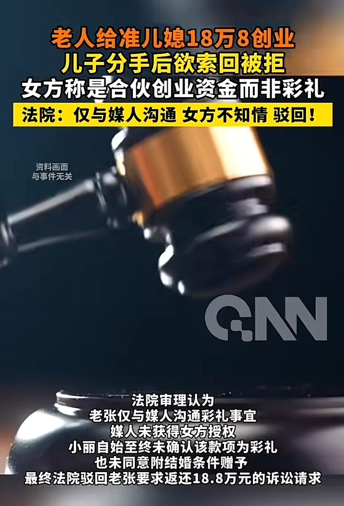 江苏泰州这事儿太闹心了。一位父亲为促成儿子婚事,给准儿媳小丽转了18.8万创业。可两人分手后,男方索要这笔钱被拒。法院驳回男方诉求,因为小丽坚称这是合伙创业资金,聊天记录也围绕创业,转账还没书面协议或用途备注。 从情理上讲,要不是为了孩子结婚,哪个老人会给女孩转这么多钱,小丽这么做真不地道。但法律讲证据,男方家转账时没留证据,只能认栽。这也给大家提了个醒,大额转账一定要说明用途并留好证据,不然就像这男方家,损失18.8万,代价太大了。
