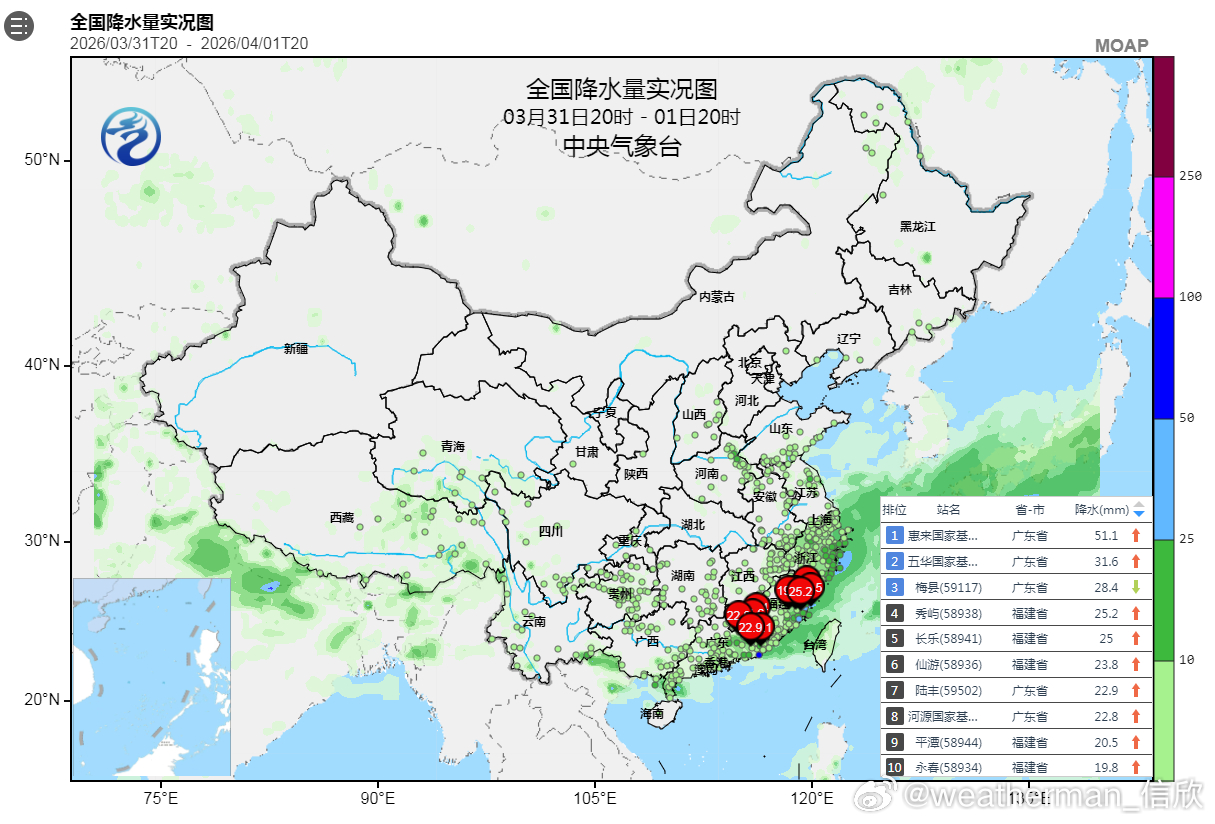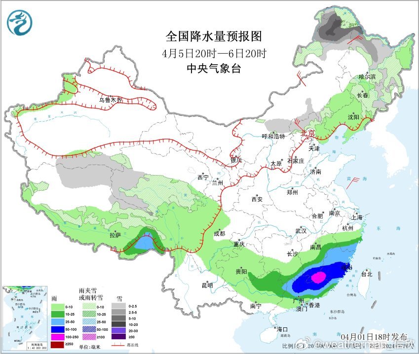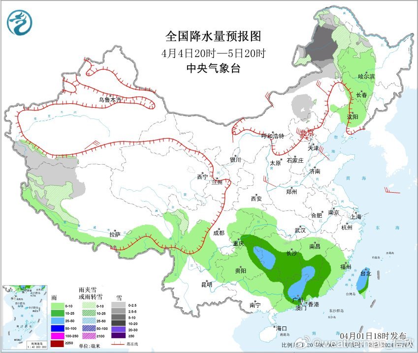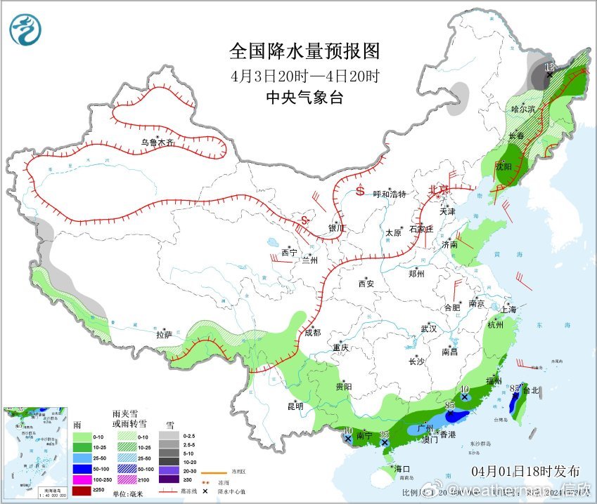 4月3日20时至4日20时,黑龙江北部局地有大到暴雪(10~12毫米);黑龙江东北部、辽宁东部、福建东部和南部、广东中南部、广西南部、台湾岛等地部分地区有中到大雨,其中,广东东南部、台湾岛西部等地部分地区有暴雨(50~85毫米)。