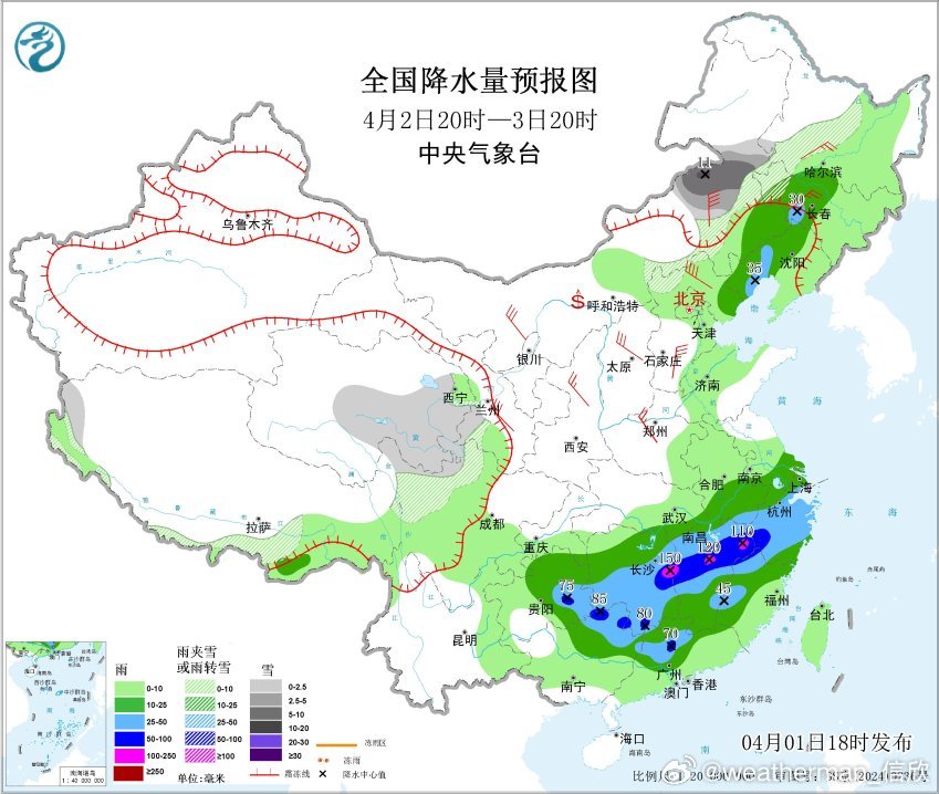4月2日20时至3日20时,内蒙古东北部局地有大到暴雪(10~11毫米);吉林中部、辽宁西部和北部、江南大部、华南北部、贵州中东部等地部分地区有中到大雨,其中,贵州东部、湖南东部、江西中北部、浙江西南部、福建西北部、广西北部、广东北部等地部分地区有暴雨或大暴雨(100~150毫米)。