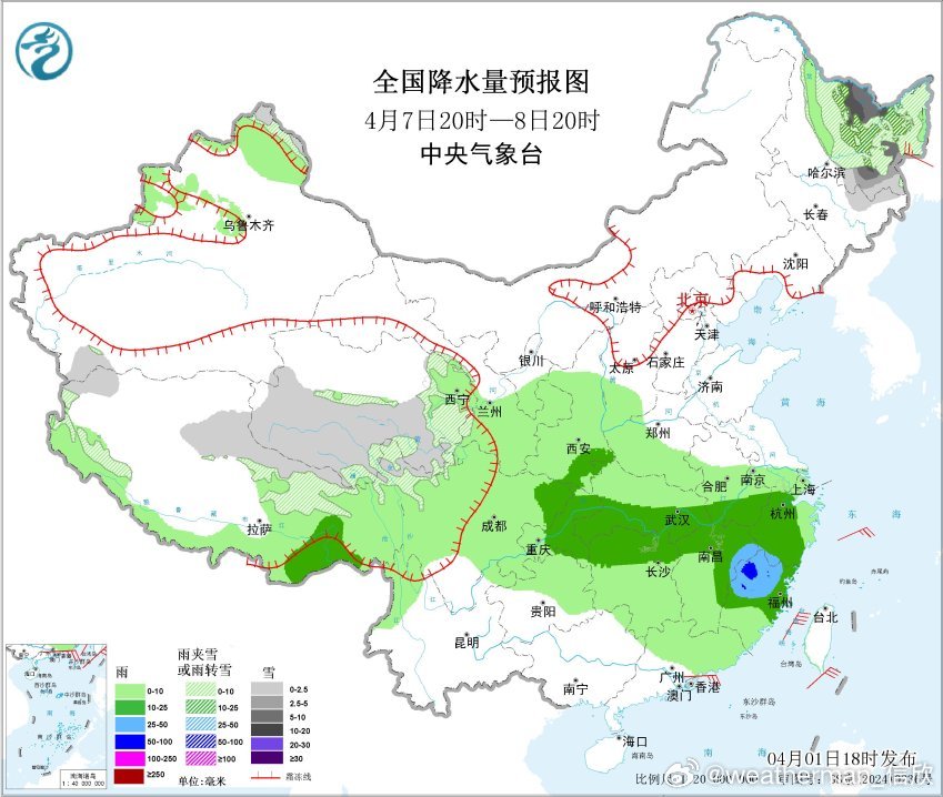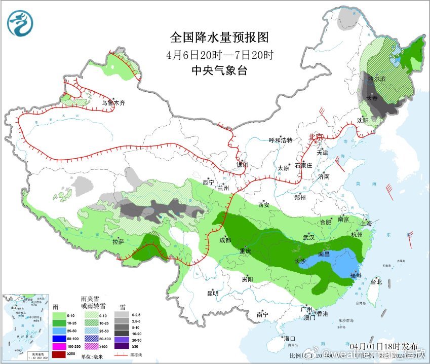 4月1日20时至2日20时,青海南部等地部分地区有大雪(5~9毫米);西藏东南部、西南地区东部、江南大部、广西东北部、广东西北部等地部分地区有中到大雨,其中,湖南南部和东部、江西西部、广西东北部、广东西北部等地局地有暴雨(50~60毫米)。