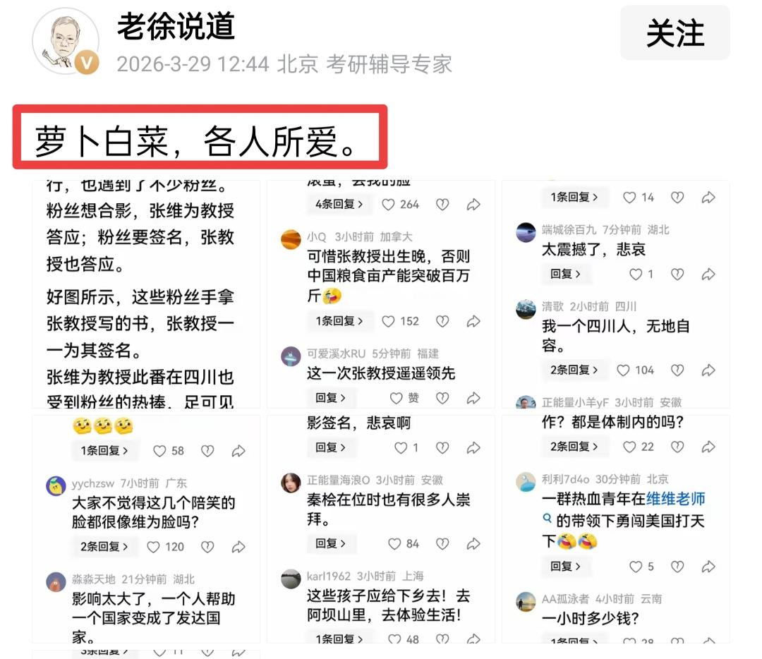 老徐说道评价张维为。 近日,我写了两个关于张教授的短评,“老徐说道”先生对这两个短评进行了评价。 老徐先生的评价很短,但也有参考价值。他的第一篇评价是:下面的评论不和谐呀! 第二篇评价是:萝卜青菜,各有所爱。 老徐先生的评价,是针对评论区的内容发表的。我们都知道,在网络上有人喜欢张教授,也有人不喜欢。因此,老徐先生点出了评论区观点不一的现象,之后也没说什么。到第二次点评的时候,老徐先生使用老话表达了应当尊重个体差异的观点。