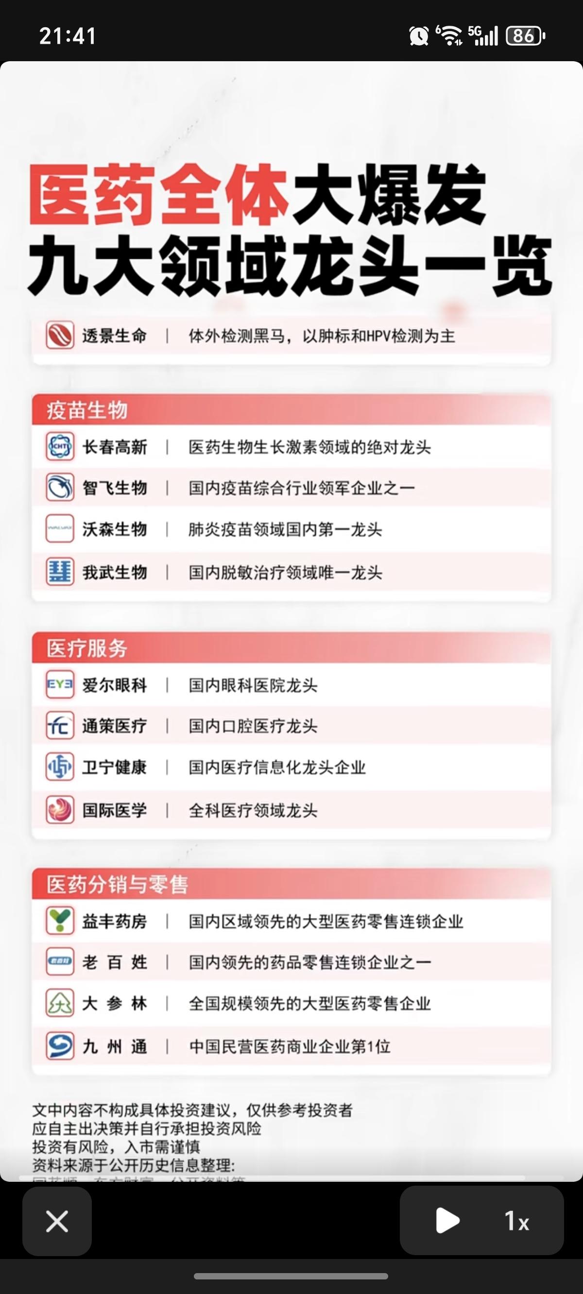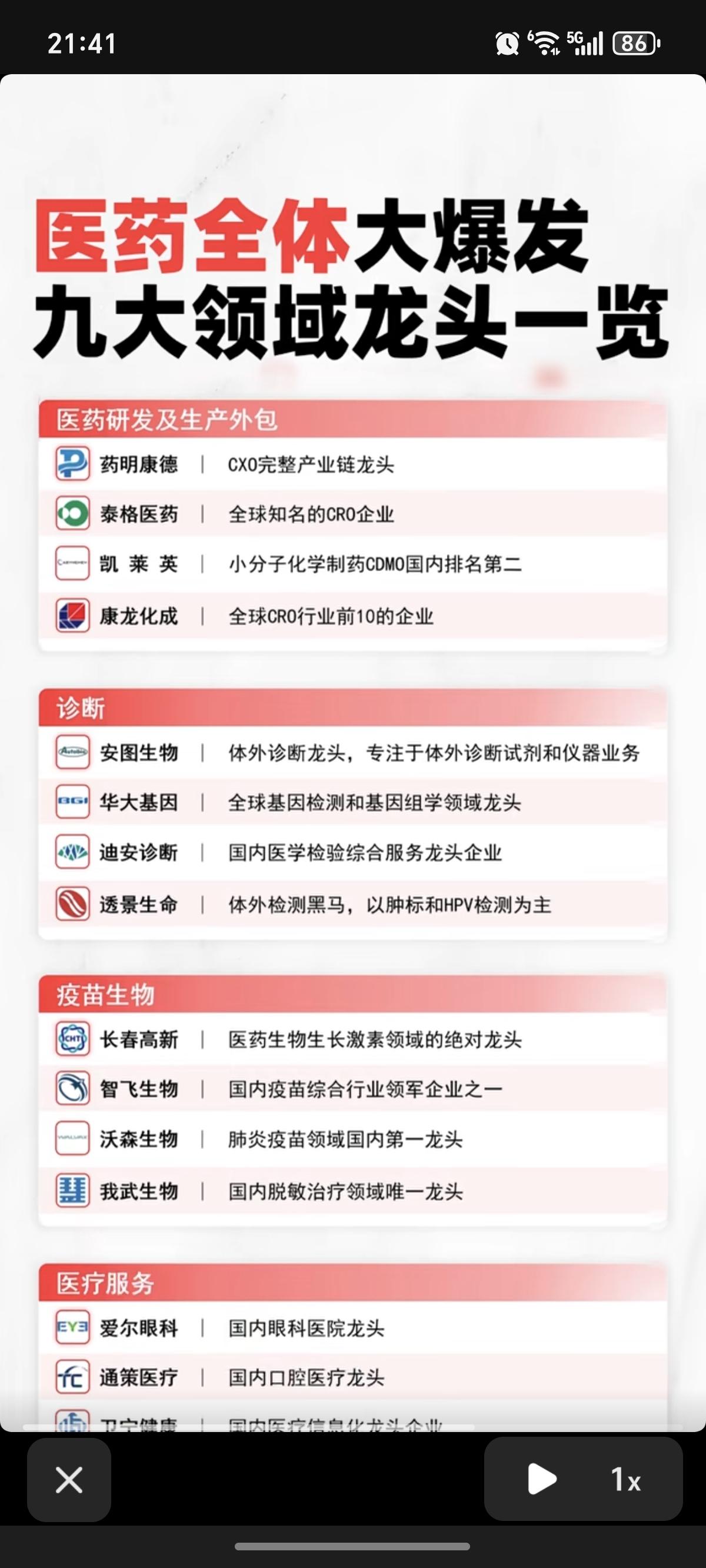 医药全体大爆发!九大领域龙头一览! 1.化学原料 2.化学制药 3.医疗器械 4.中成药 5.医药研发及生产外包 6.诊断 7.疫苗生物 8.医疗服务 9.分销