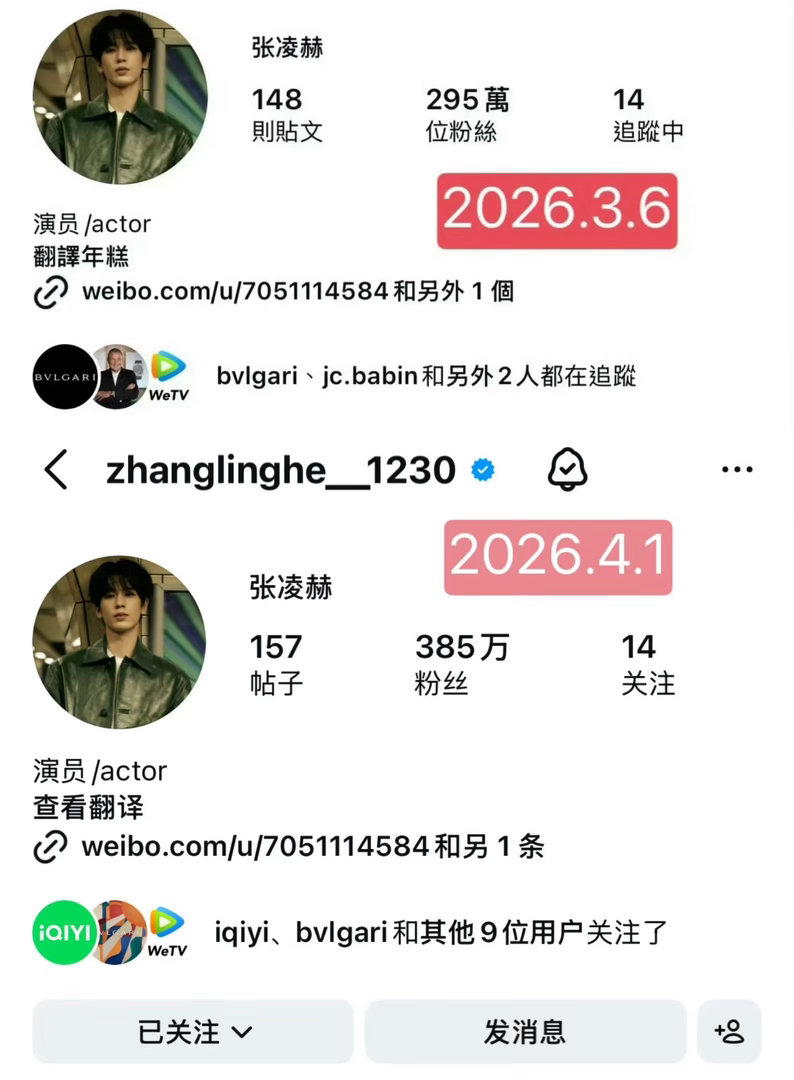 张凌赫逐玉开播后ins不到一个月涨粉90w,首条破百万👍🏻!
