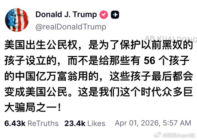 赴美生子这事,弄不好还真的要被堵死了。特朗普早间再次发布推文,表示在美国出生就有公民权,是为了保护以前黑人奴隶的孩子而设立的,而不是给那些生了 56 个孩子的中国亿万富翁。大家猜测这个亿万富豪就是某网络公司董事长,在今年初,其还在微博上晒出了 50多个在美代孕孩子们集体跳舞的视频。