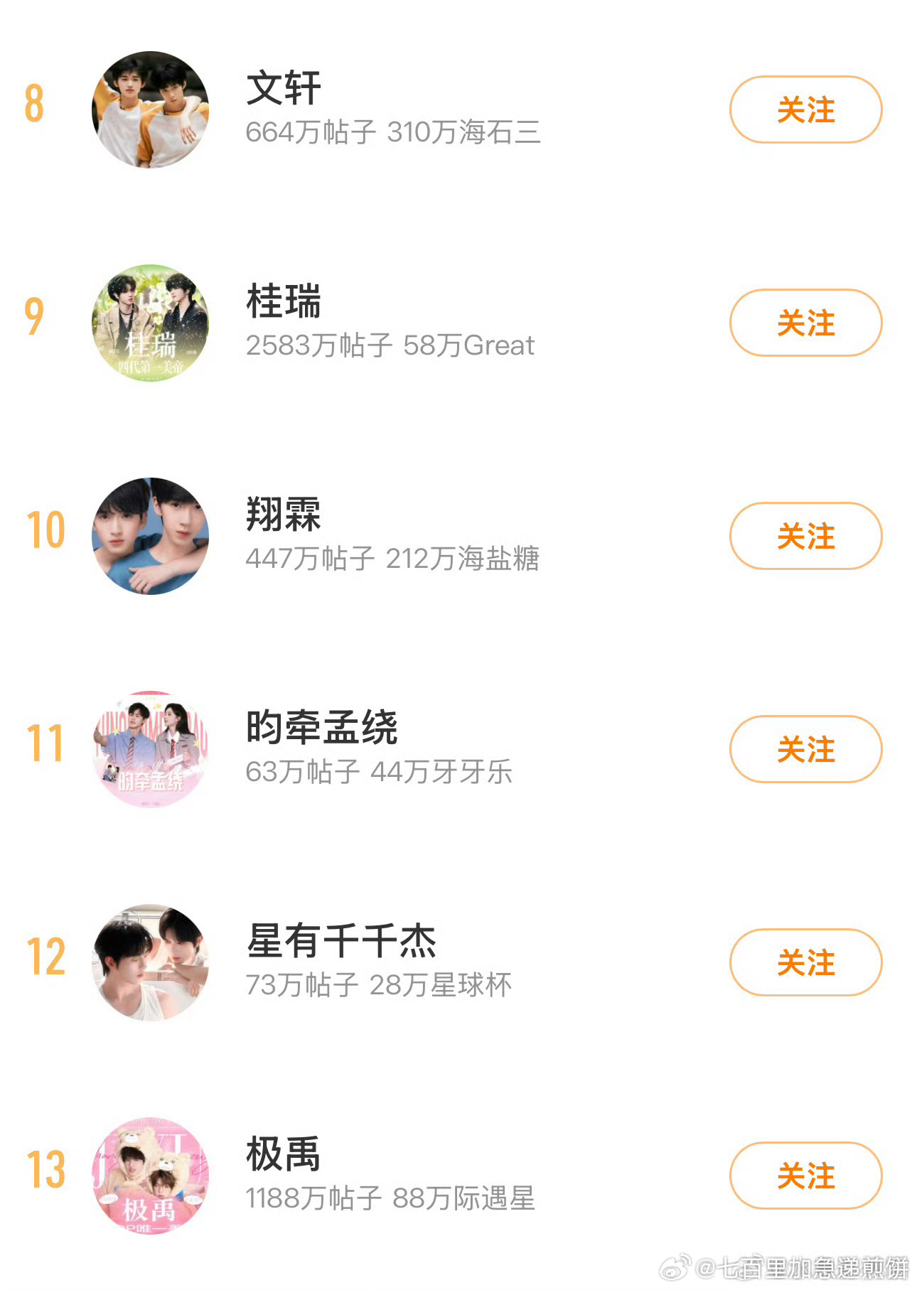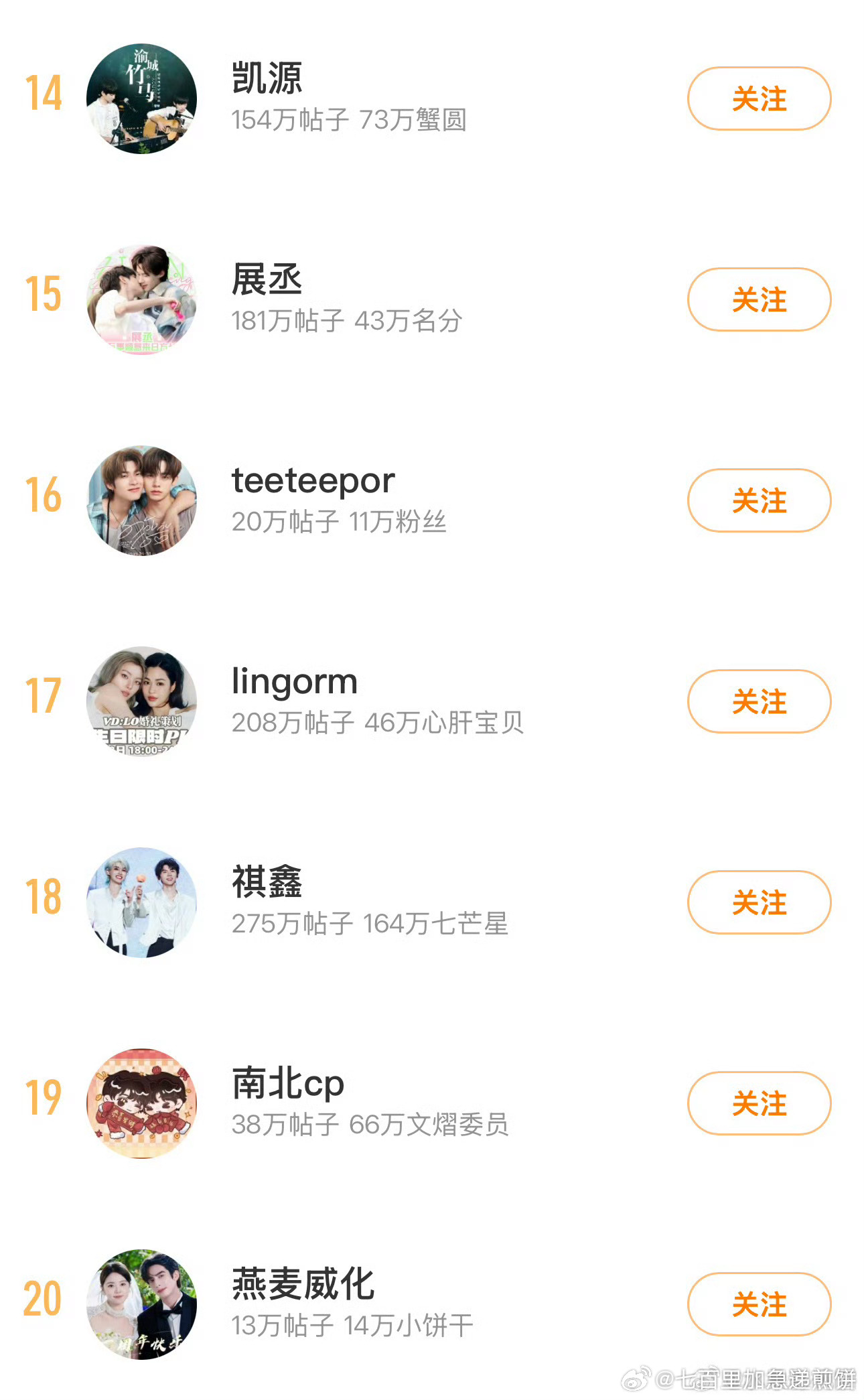 愚人节cp榜排名一览:橹穆、博君一肖、云熠星河、田作之赫、奇文豚馒、朱苏、文轩、桂瑞、翔霖、昀牵孟绕星有千千杰、极禹、凯源、展丞、teeteeporlingorm、祺鑫、南北cp、燕麦威化