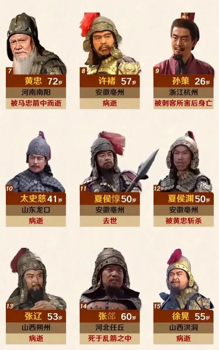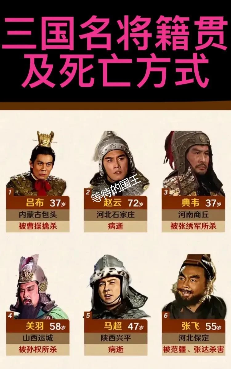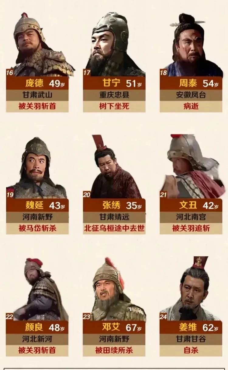 如图所示,24位三国名将简介一览图。整体来看,他们基本都来自北方,并且绝大多数寿龄没有超过60岁。更为重要的一点仅有1人获得善终,他就是赵云。从赵云的经历就可以看出,一是自己要有真本事,这样才能得到重用。二是要跟对人,最初可以不强,但是最后却能建立属于自己的王朝。三是为人一定要低调,谦逊,争取能做到居功不自傲。当然三国时期的名将,要做到善终真的很难,不过对于武将来说,最高的荣誉就是战死沙场,他们也算死得其所了。