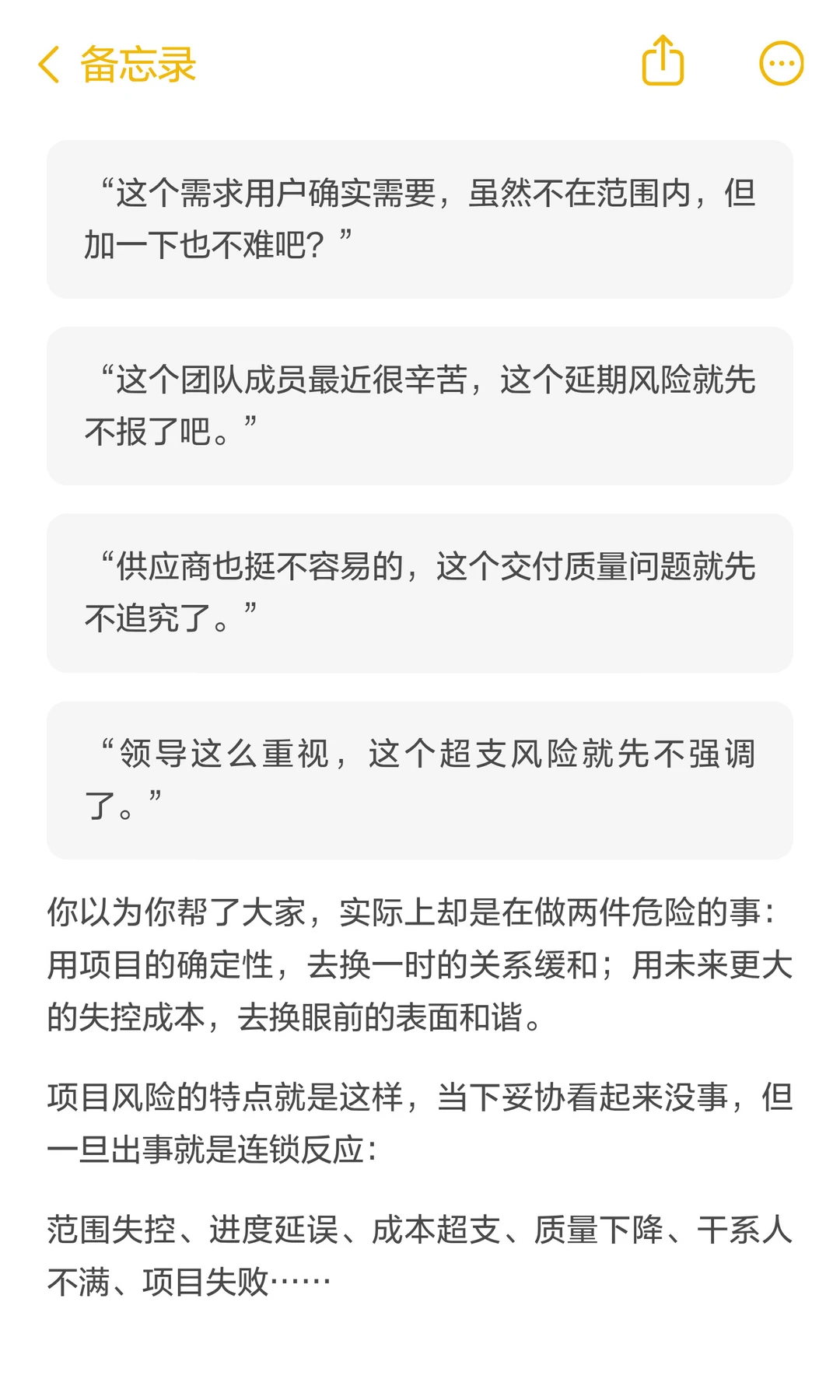 你遇到过这些场景吗? 业务方:“顺手加个需求,不影响上线吧?” 技术负责人:“风险知道,但时间紧,先做着看。” 领导:“项目很重要,按时交付,资源自己想办法。” 团队成员:“评估要5天,你说3天,那就按3天报,到时候再说。” 你如何应对呢?