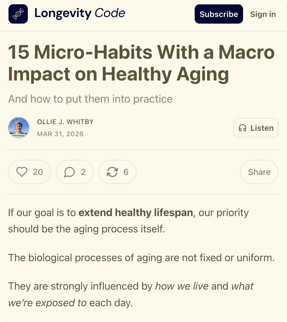 外媒:15个微习惯,长期坚持让你老得更慢 生物研究者Ollie J. Whitby指出,衰老的生物过程并非固定不变,日常生活方式对其影响深远。健康老龄化不需要极端方案,关键在于坚持做对的小事。 他梳理了15个有研究支撑的微习惯:每天早晨户外接受10至15分钟自然光以校准生理节律;饭后步行10分钟可将餐后血糖峰值降低20%至30%;饭前做3次深呼吸有助消化;每天冥想10分钟可减缓大脑老化;睡前15分钟阅读代替看屏幕;睡前3小时内避免进食;每周力量训练两次以维持行动能力;每天任何形式运动30分钟;刷牙时单脚站立练习平衡;固定吃营养丰富的早餐;以水果或坚果替代垃圾零食;选用高品质特级初榨橄榄油;减少食用加工肉类和酒精等一类致癌物;每日安全日晒15至60分钟补充维生素D;最后,建立一份"最低限度健康习惯清单",利用大脑对持续感的依赖保持动力。 Ollie J. Whitby强调,不必面面俱到,从一两个习惯开始,靠持续性积累长期效果。