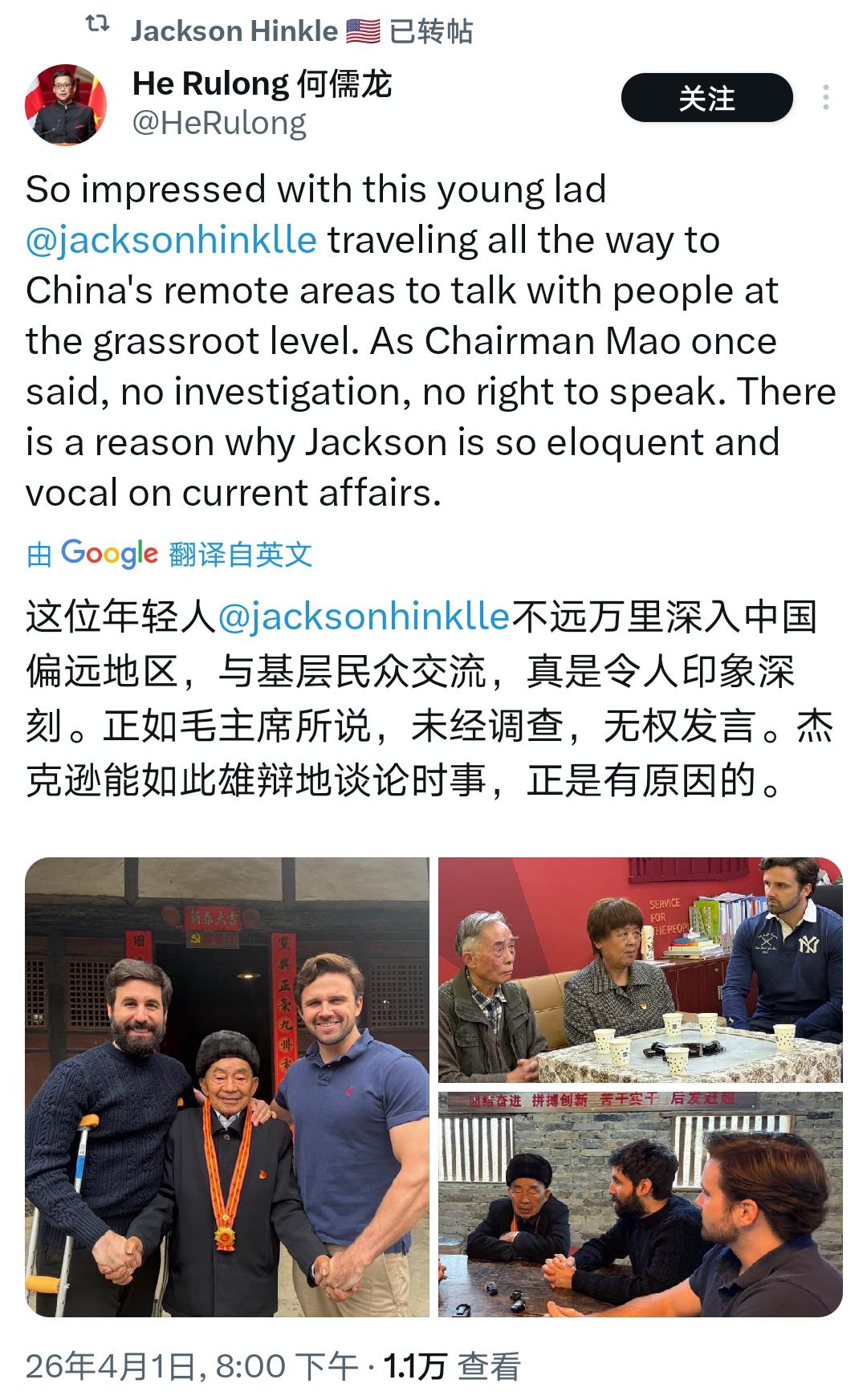 这是两国两代共产党人,跨越重洋的精神会师! 西方媒体把中国脱贫抹黑成 “骗局”,可美国年轻共产党组织创始人杰克逊・欣克尔与他的同志,却亲自来到中国老区,用自己的声音,把中国共产党人的愚公精神原原本本展示给全世界 —— 中国 “当代愚公” 黄大发,用 36 年凿出 9 公里天渠,带领数千村民走出贫困;贵州 8 年实现近千万人脱贫,88 个贫困县全部摘帽。 平凡至极,又伟大至极。 这不是简单的 “外国人夸中国”,而是美国无产阶级革命者,向中国基层共产党人最真诚、最高的致敬。 Source: X
