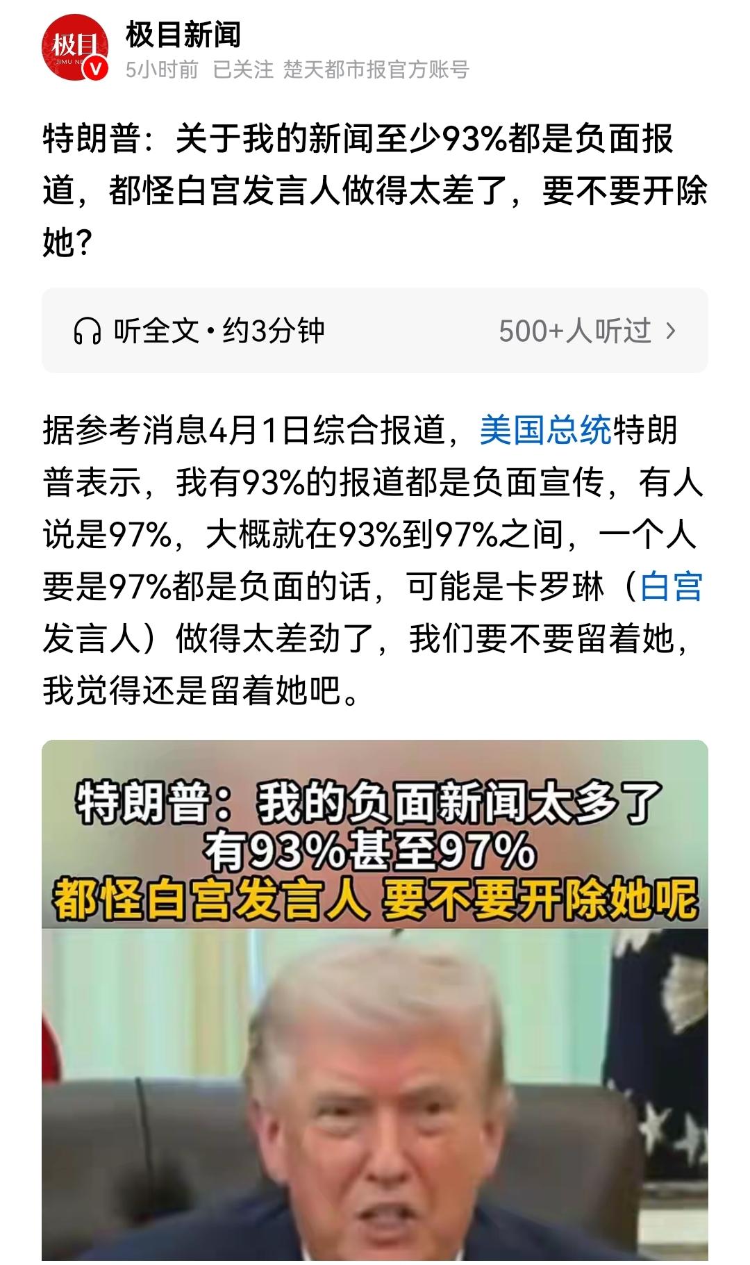 真不能怪卡罗琳,她替特朗普擦了多少屁股,特朗普自己恐怕压根没意识到。 明眼人都看得出来,卡罗琳千方百计维护特朗普的形象,甚至多次与媒体发生正面争执。从业务方面来讲,可谓尽职尽责。 不客气地说,换作其他新闻秘书,特朗普的负面舆论只会更多。 这也侧面说明一个问题:特朗普从来不会从自己身上找原因。 俄乌冲突久拖不决、美国劝和效果有限,他就怪拜登,称这是“拜登的战争”,与自己无关。 美伊对抗对美国不利,他又甩锅防长赫格塞思,称当初是对方强烈主战,自己才同意动手。 美国国内通胀高企,他再怪美联储主席鲍威尔,称正因对方不肯降息,才让民众背负生活压力。 总而言之,全是别人的错,他自己半点责任没有。 身为一国总统,靠社交平台治理国家,朝令夕改、反复无常,毫无稳定性可言。 这样的人,竟是美国选民选出来的。 可谓自食其果,自己选的路,跪着也要走完。