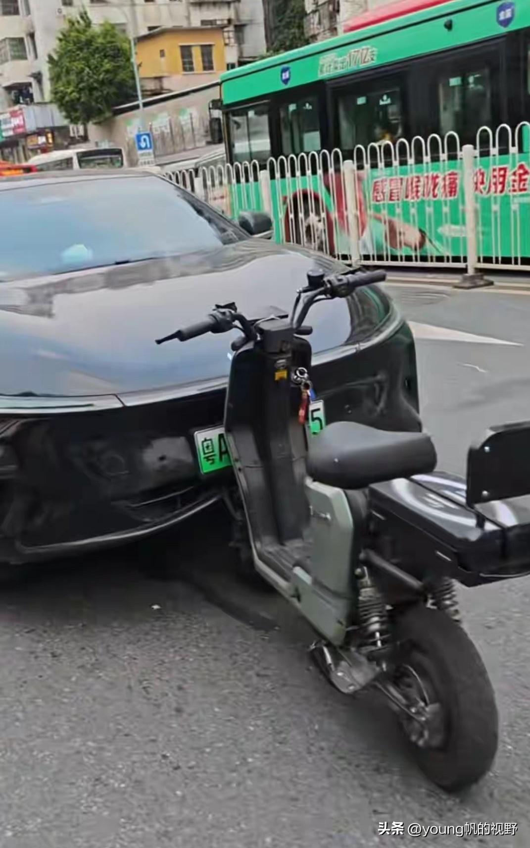 网友在广州街头拍摄到的一幕电鸡交通事故场景。一辆电鸡在逆行方向直插进了一辆小车的正前方。从现场画面看,这力度可不小呢,电鸡嵌进去了小车的车头,夹得非常紧,直接屹立不倒。小车的前杠也严重变形了。画面中没看见驾驶人的情况,从画面判断的话,人应该没有大碍。但这种驾驶就实在太乱来了,倒霉的又是小车。