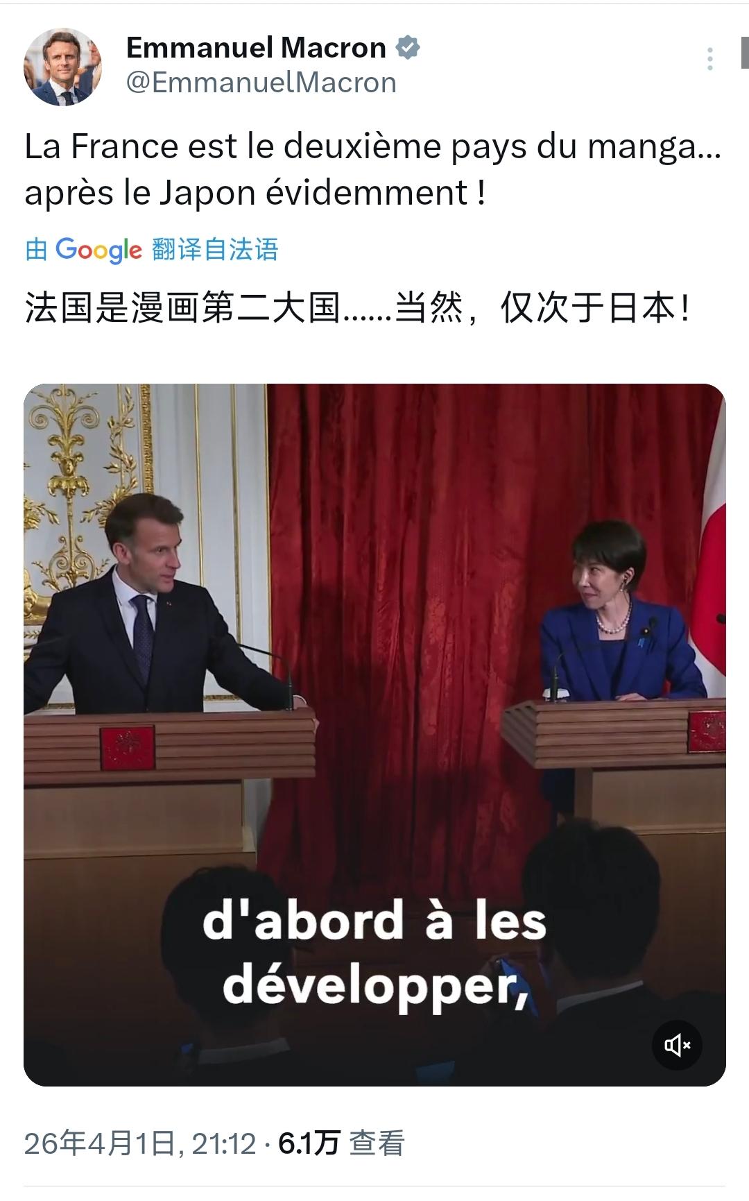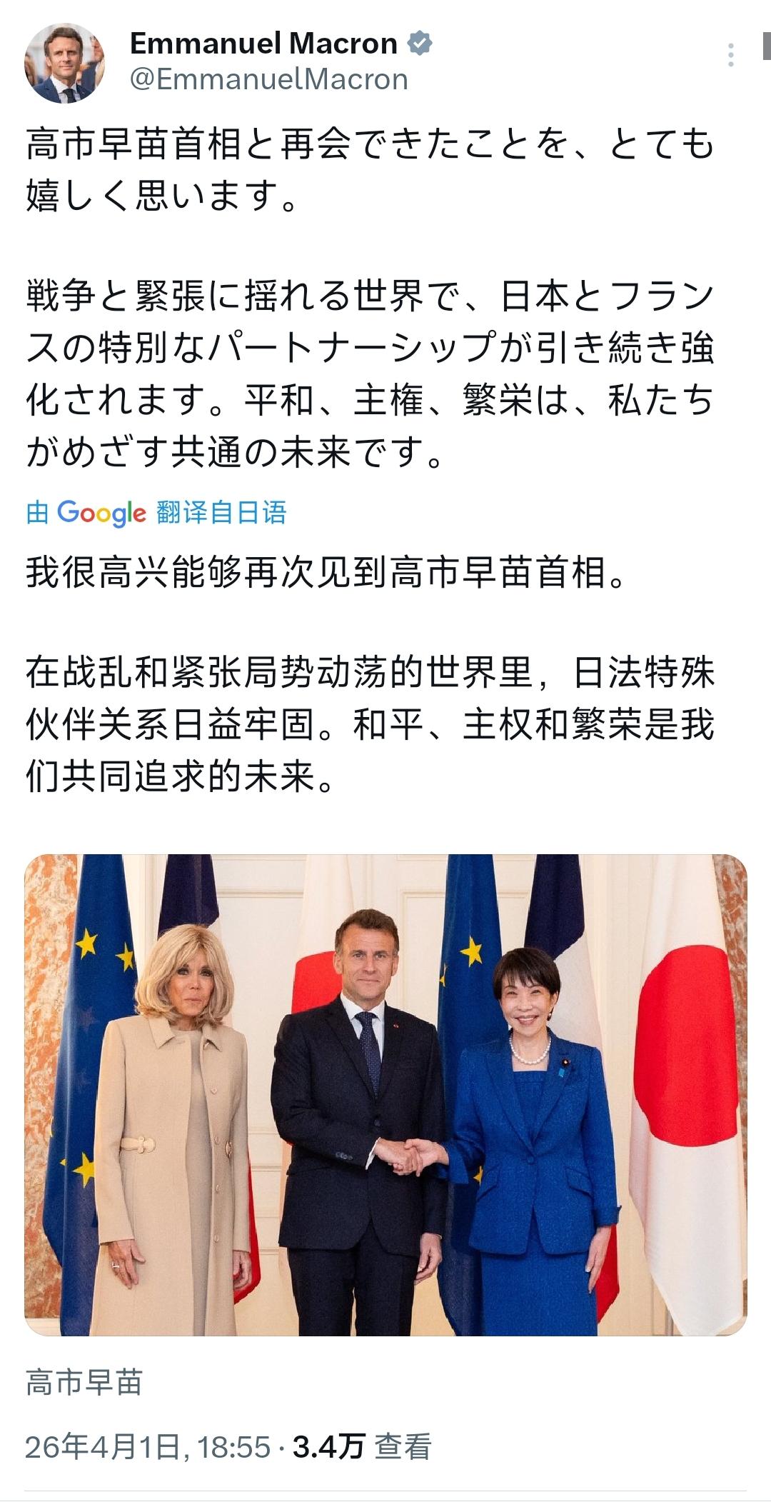 法国总统马克龙今晚(4月1日晚)用日文法文写道:“我很高兴能够再次见到高市早苗首