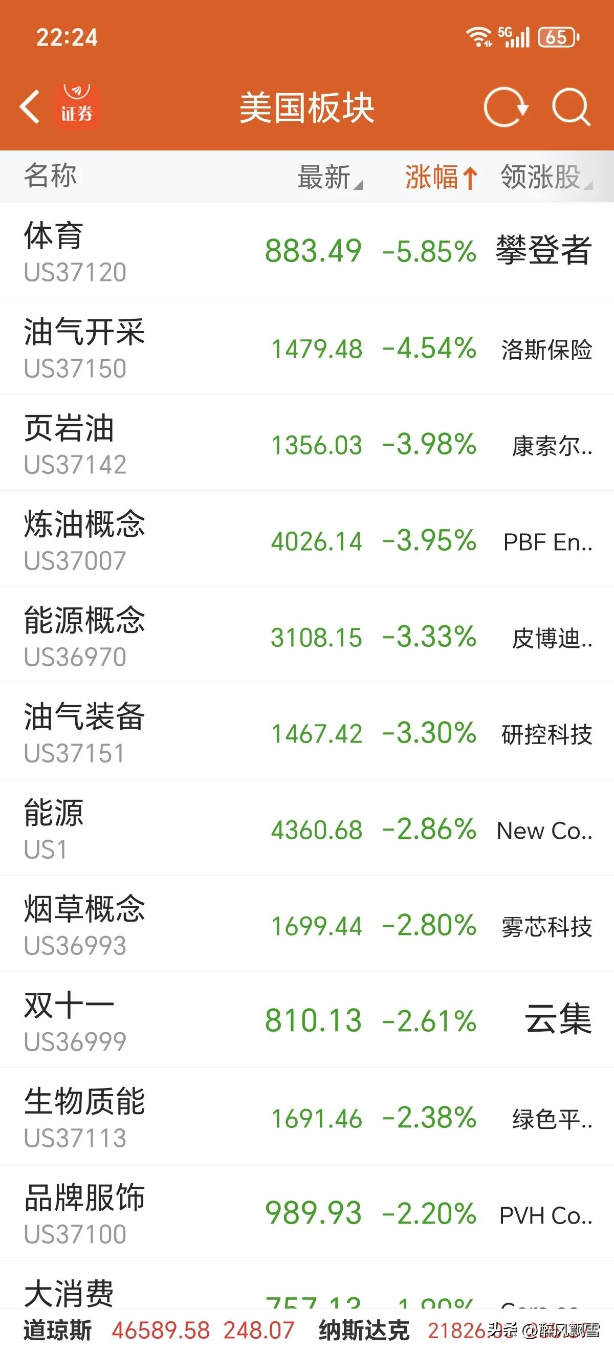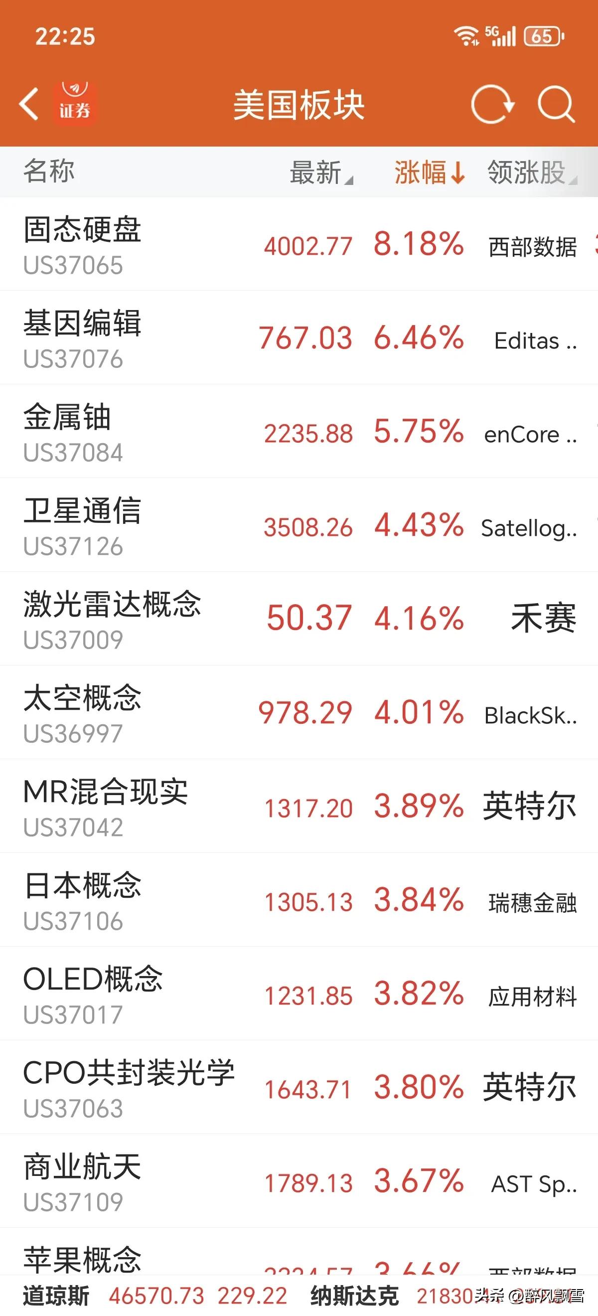 美市开盘记录 高开高走,不靠谱只要不胡说,美市收小阳。外围市场正面,大A明天防回落! 美市后续看好20日线,纳走势慢于道指一拍,触碰20日线必回睬调整,大A也如此,附合单边下跌第二阶段。 美股三大指数全线收涨,纳指领涨1.17%,标普500涨0.72%,道指涨0.57%,科技成长风格占优。固态硬盘、基因编辑、商业航天、CPO等板块大幅领涨,能源、油气开采等板块集体回调,纳斯达克中国金龙指数小幅收涨0.38%,市场整体风险偏好回升。