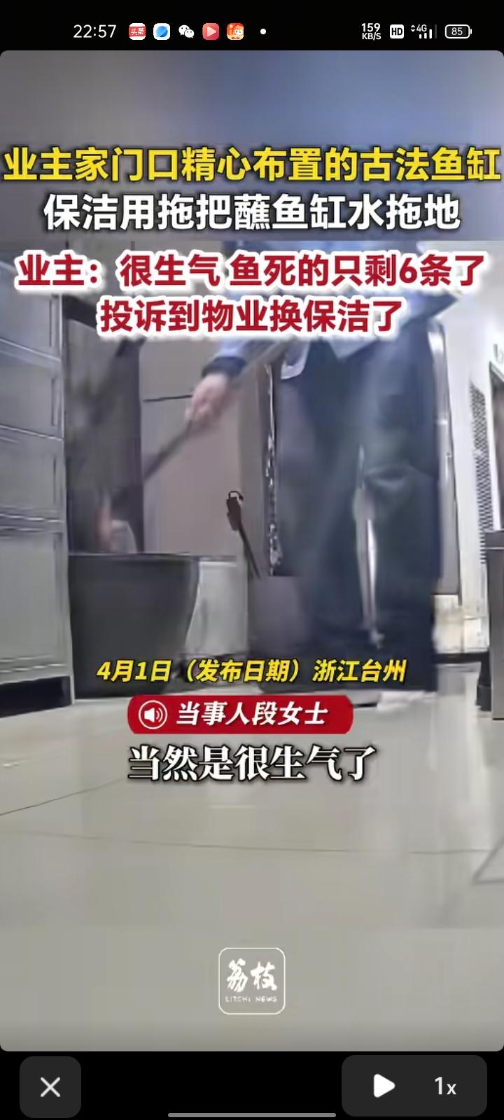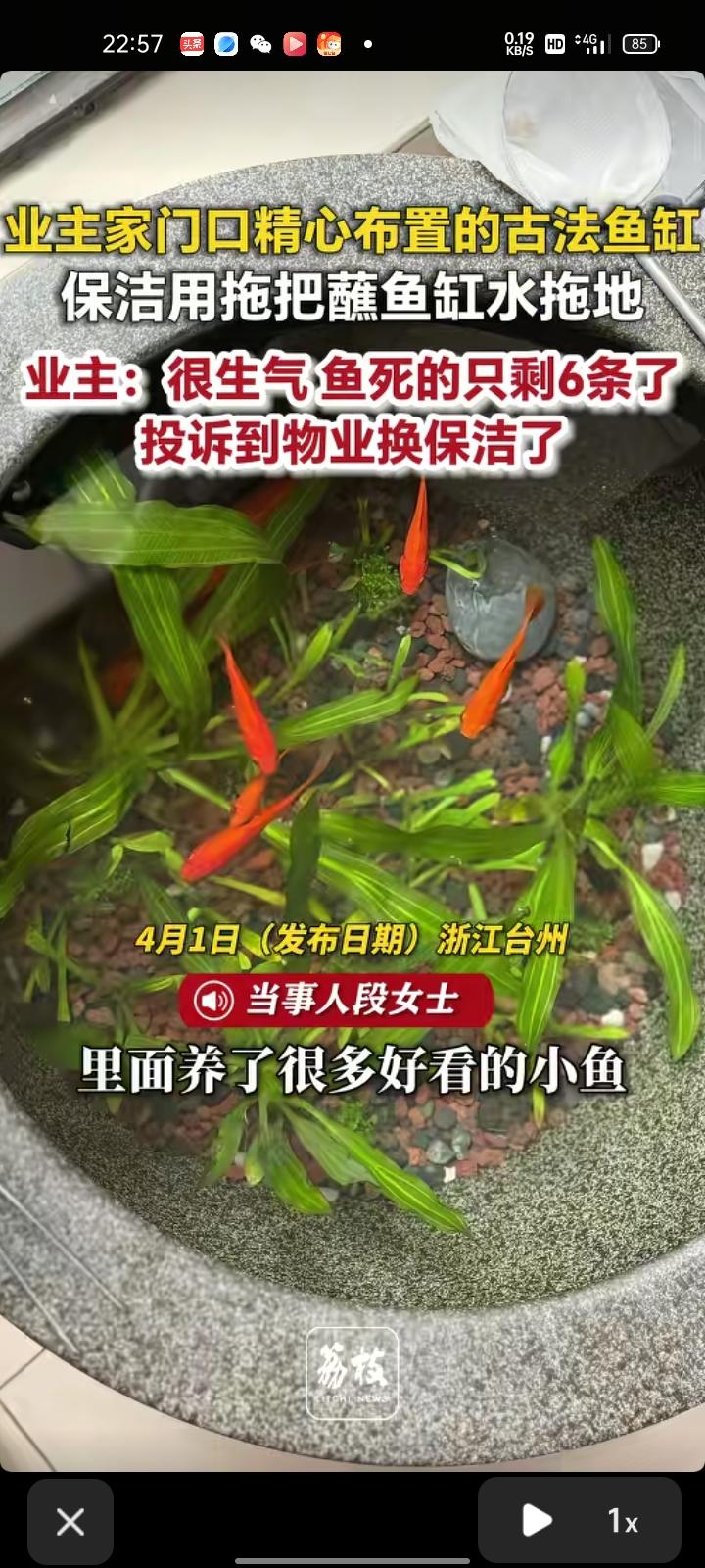 3月31日,浙江台州。段女士称,自家门口精心布置的古法鱼缸,里面养了很多好看的小鱼。一位物业保洁用拖把蘸鱼缸水拖地,里面的鱼死了六条,经常有毛巾上掉下来的碎屑和头发。 提醒过保洁两个月后,他又开始在浴缸里洗拖把,非常生气,已向物业投诉。