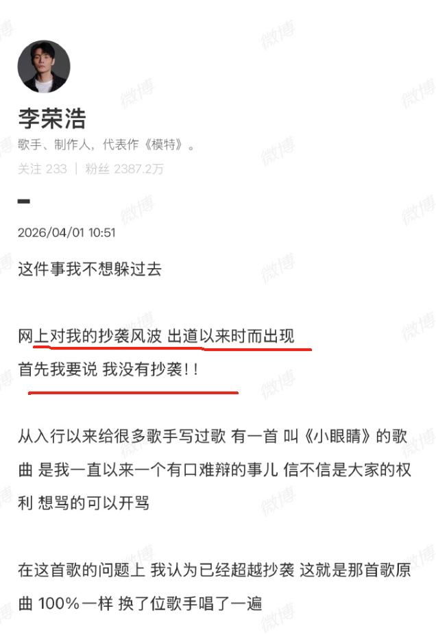 李荣浩一个人可以抵一个公关团队! 李荣浩确实太聪明了,选择在自己风评最好的这几天解释自己的抄袭风波,必然换来的是一片理解和相信,而他更聪明的是,在声明的结尾,还专程提到不关单依纯粉丝的事,别去找他们,他这波操作,直接让网上骂他那部分单依纯粉丝的火熄灭了一大半,而他本人不但减少了很多骂声,还落了一个有格局的好名声,实在是高!