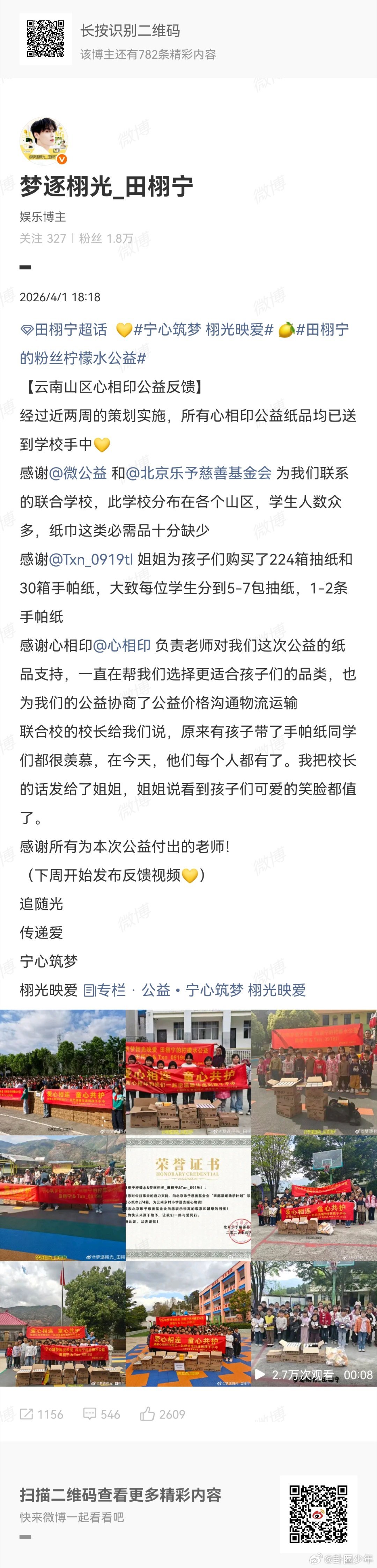 田栩宁粉丝云南山区公益反馈心相印公益暖彻山区,田栩宁粉丝用实际行动传递善意,偶像与粉丝双向奔赴美好,满满都是治愈力量。