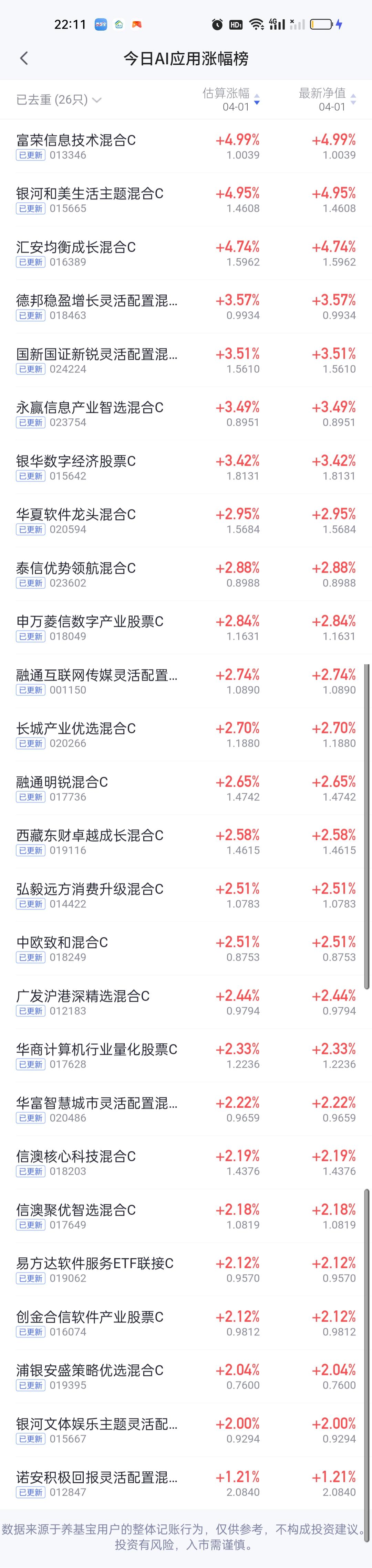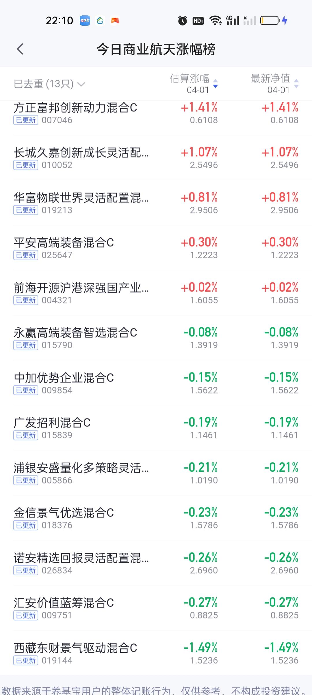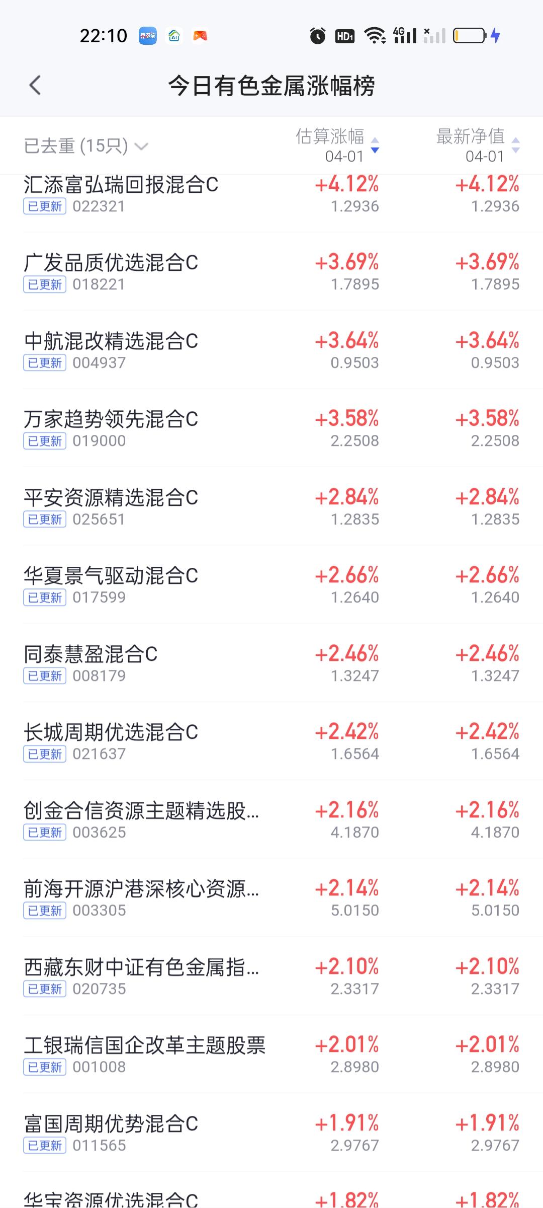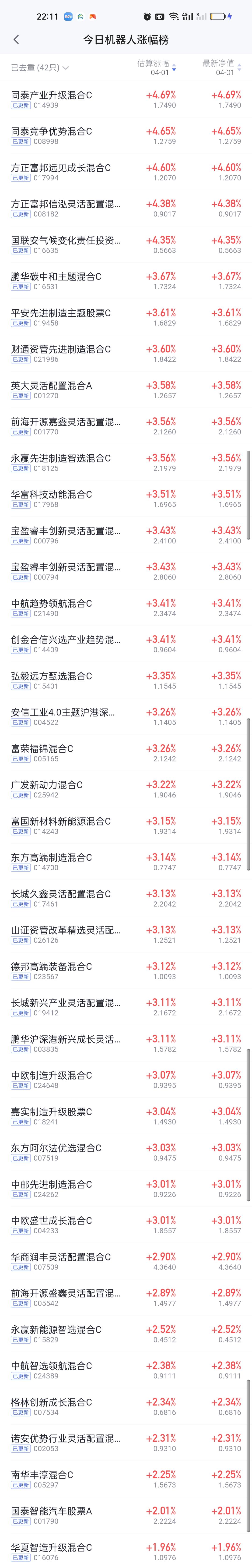 今天是难得爆发的一天,涨7%以上的基金遍地都是。赚钱效应可谓拉满。涨幅最大的肯定是创新药板块。中航优选领航大涨9.40%排名第一,中航恒宇港股通价值优选9.33%排名第二,金鹰医疗健康产业9.12%排名第三,湘财长兴8.79%排名第四,路博迈中国医疗健康8.77%排名第五。 涨幅在8%以上的基金还有金鹰责任投资8.59%,东吴医疗服务8.36%,中银港股通医药8.29%,汇安行业优选8.13%,申万菱信医药先锋8.06%,大摩沪港深精选8.00%。 有色金属,商业航天,AI应用,CPO,机器人,创新药涨幅榜一并奉上!