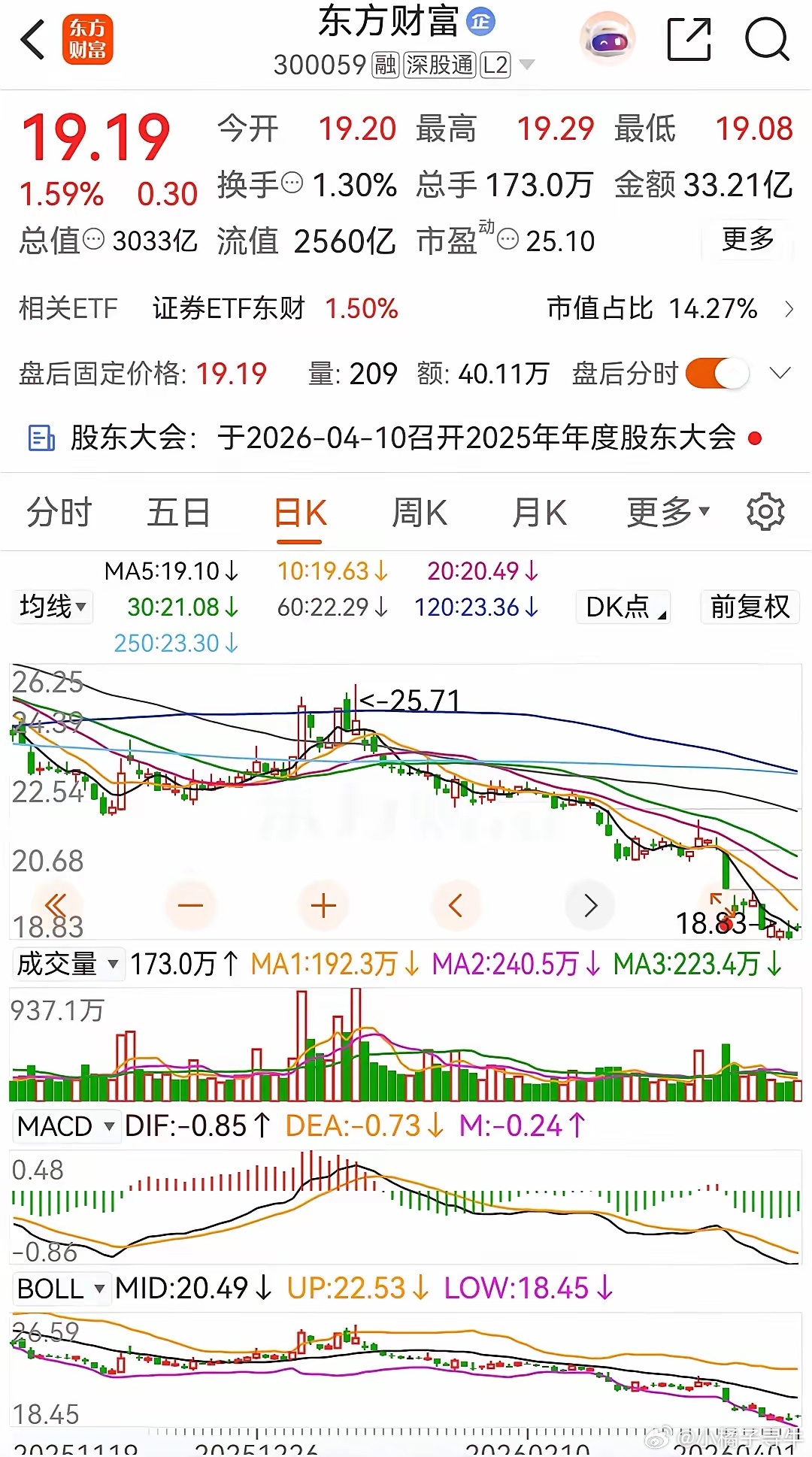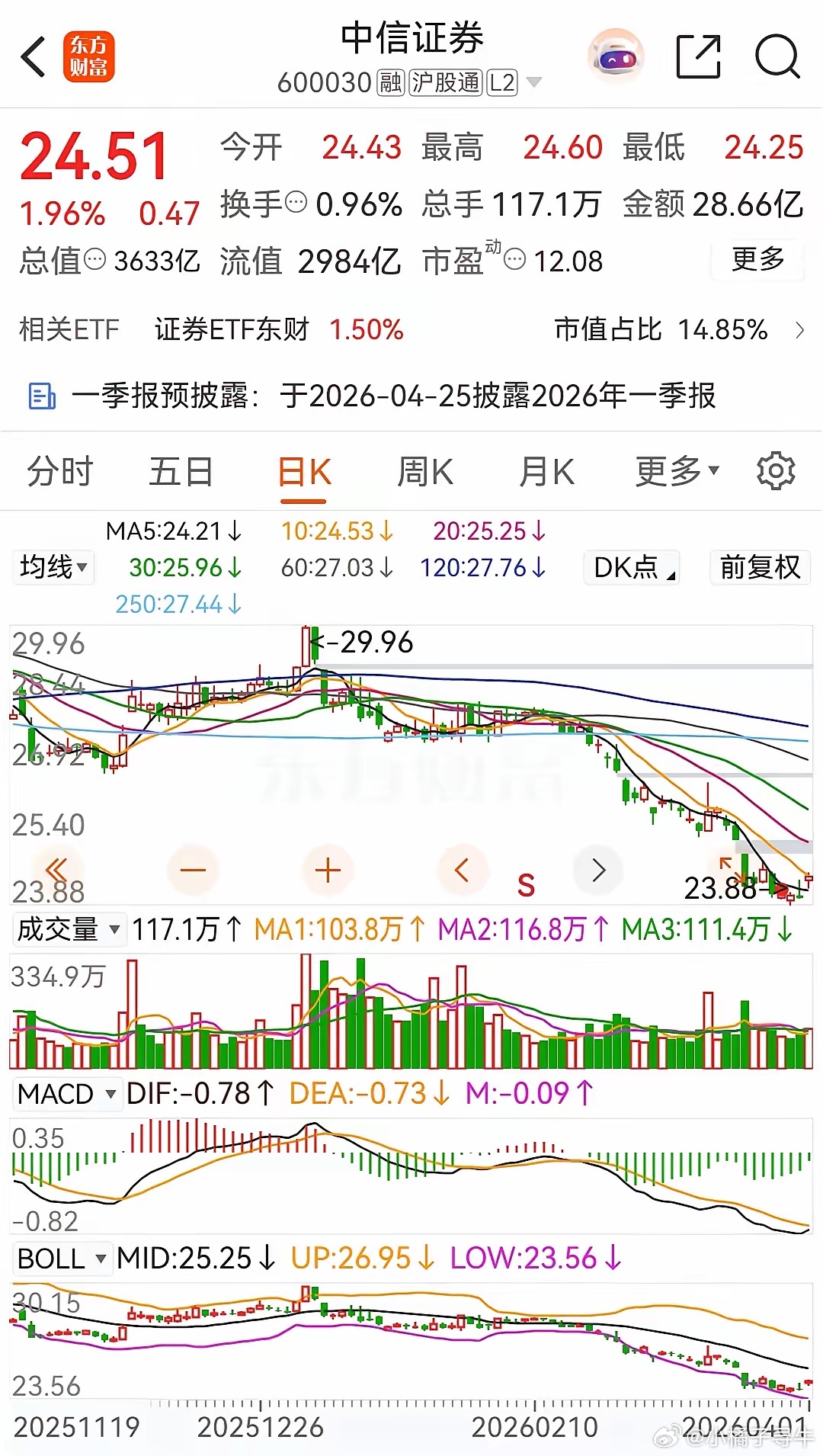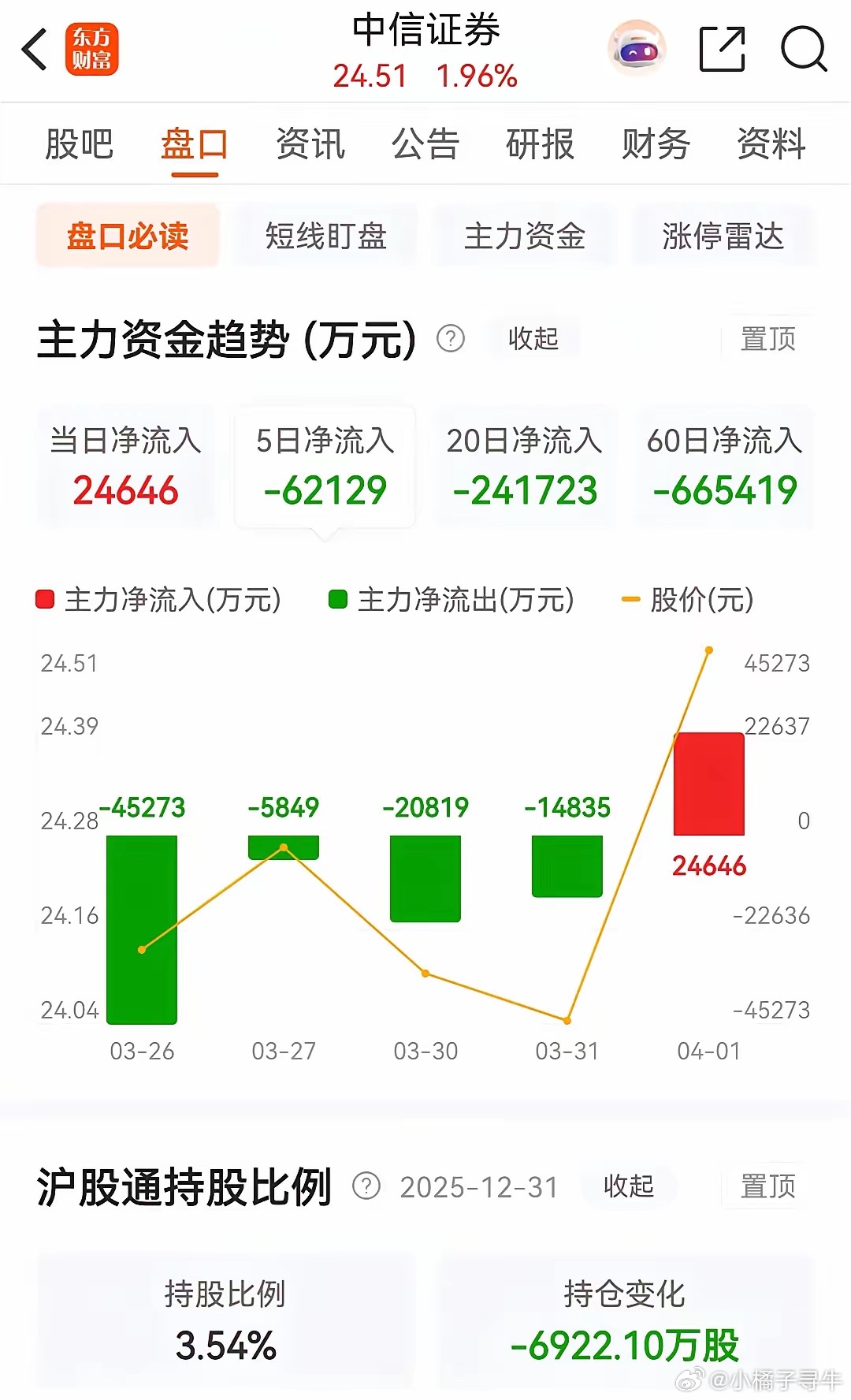 东方财富和中信证券今天双双收涨,且都被主力资金净买入。券茅东方财富今天早盘高开后小幅探底回升后在高位震荡整理 ,收盘时涨了1.59%,报价19.19元。在资金流向上,今天终于终止了连续10天被主力资金净卖出的态势,今天的净买额为1.7409亿。从走势上看,目前的整体走势依然还是处于破位态势之中。业绩方面,2025年实现营收160.68亿元(+38.46%),实现归母净利润为120.85亿元(+25.75%),扣非后归母净利润116.54亿元(+25.94%),基本每股收益0.77元(+25.68%)。中信证券今天的走势同东财一样,也是小幅高开探底回升后震荡整理,收盘时上涨了1.96%,收盘报价为24.51元。在资金流向上,今天被主力资金净买入了约2.4646亿元。从走势上看,股价站上五日均线,收盘也正好收在了10日均线处,终于是有了好的开端。业绩上,去年营业收入748.54亿(+28.79%),归母净利润300.76亿(+38.58%),首次突破300亿元,创历史新高。扣非后归母净利润303.03亿元(+40.51%),基本每股收益1.96元(+39.0%)。券茅和券商一哥之所以如此差劲,监管政策与减持事件冲击的影响太大了:监管层通过中信证券调控指数(如1月7日14.5亿卖单压盘),削弱市场信心。东财富的实控人家族年内减持套现92.4亿元,加剧了高估值压力。