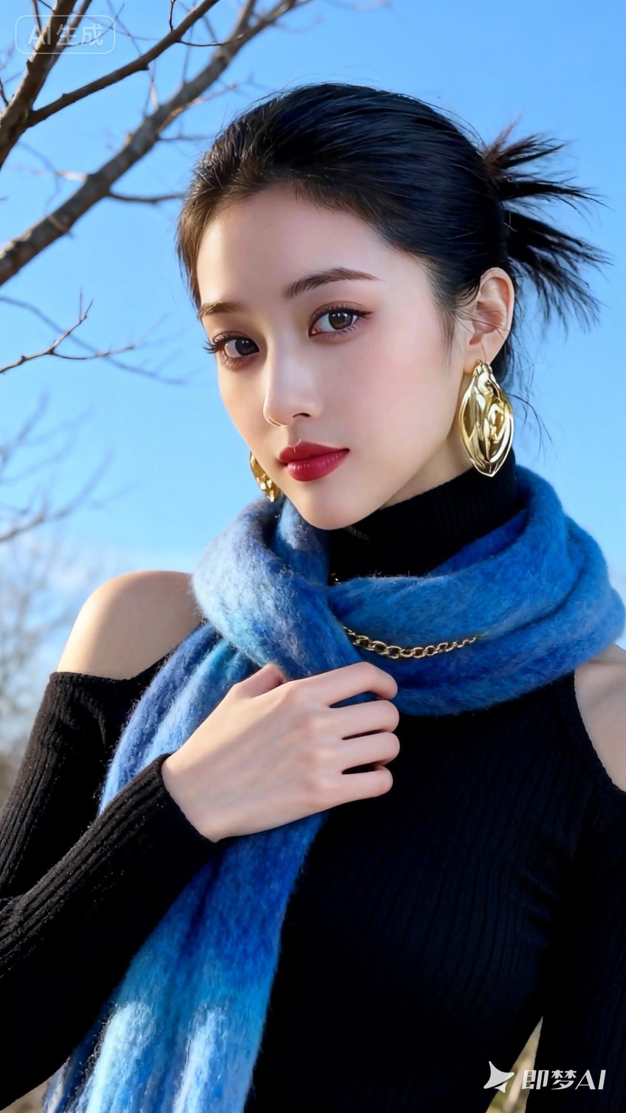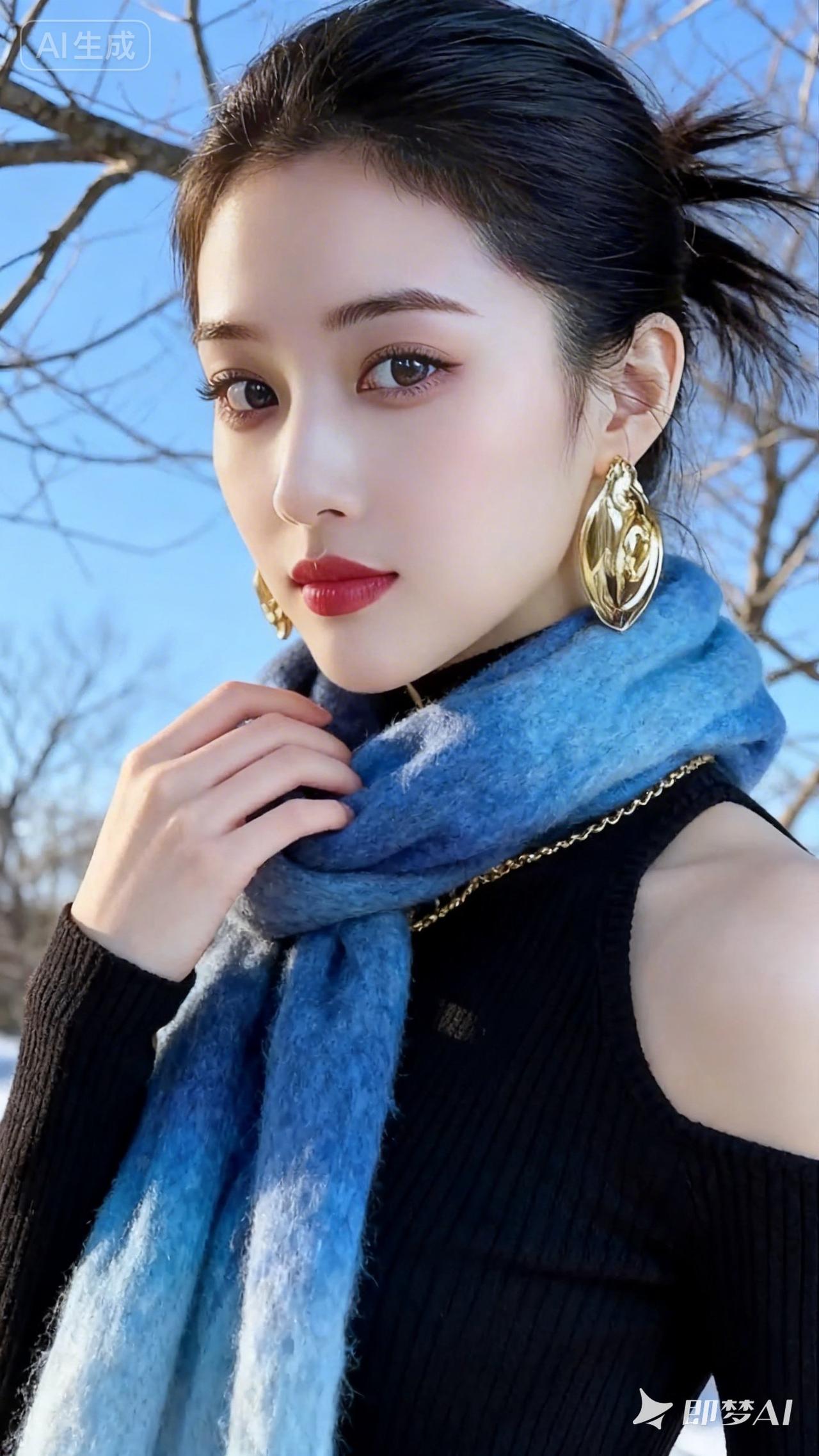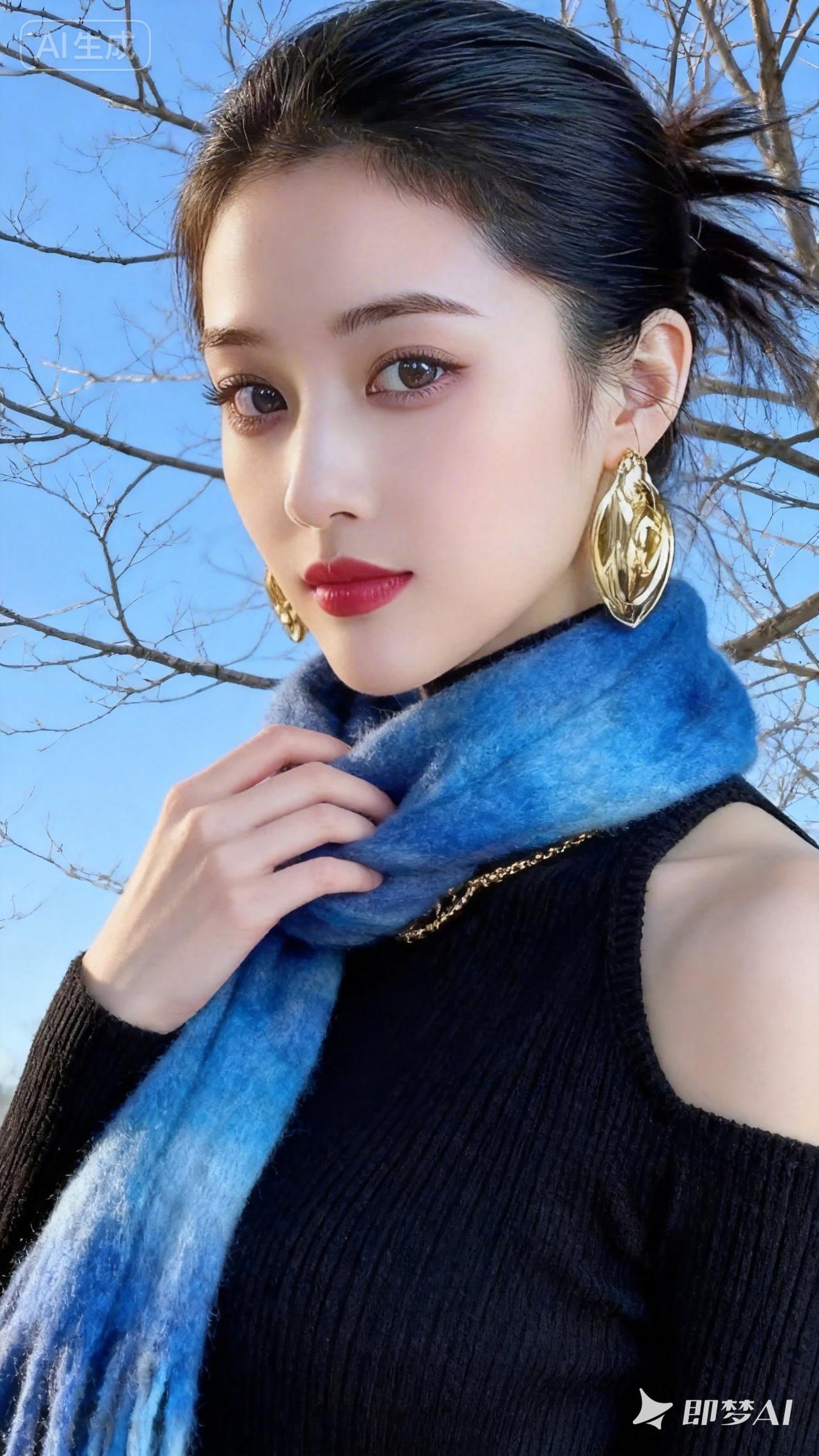 冬日暖阳下,蓝丝巾与金耳环的时尚碰撞,尽显优雅与温暖。