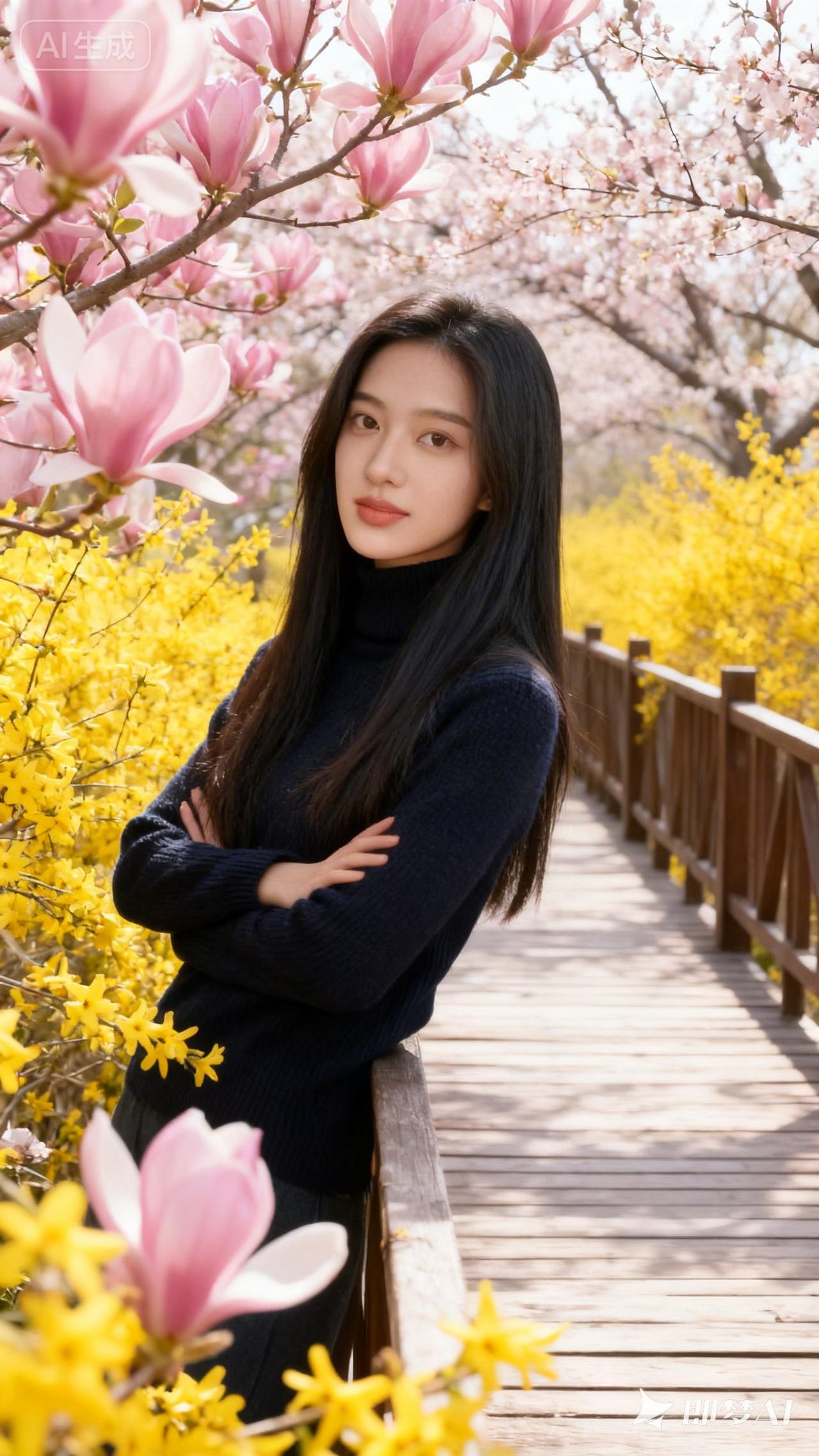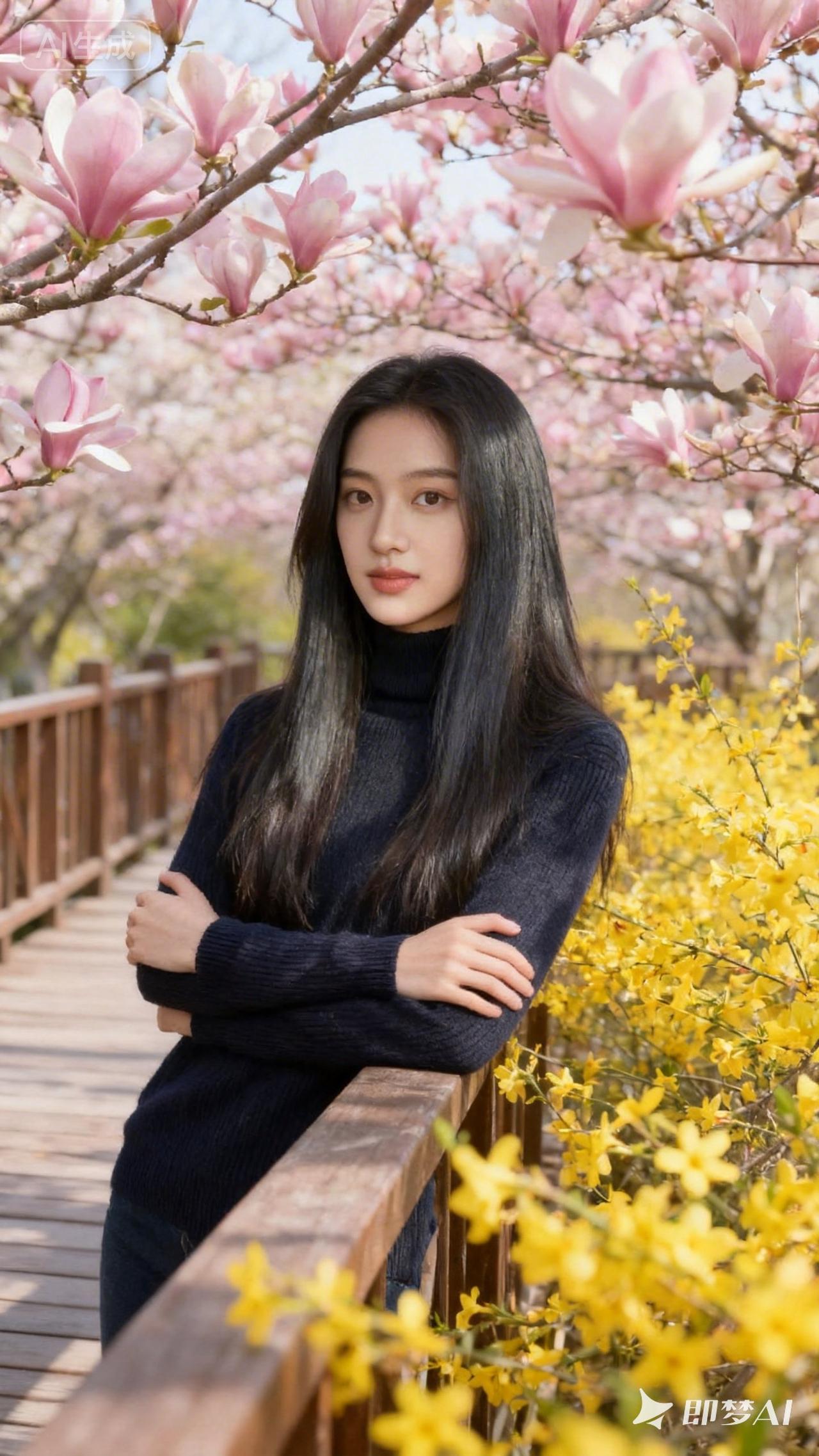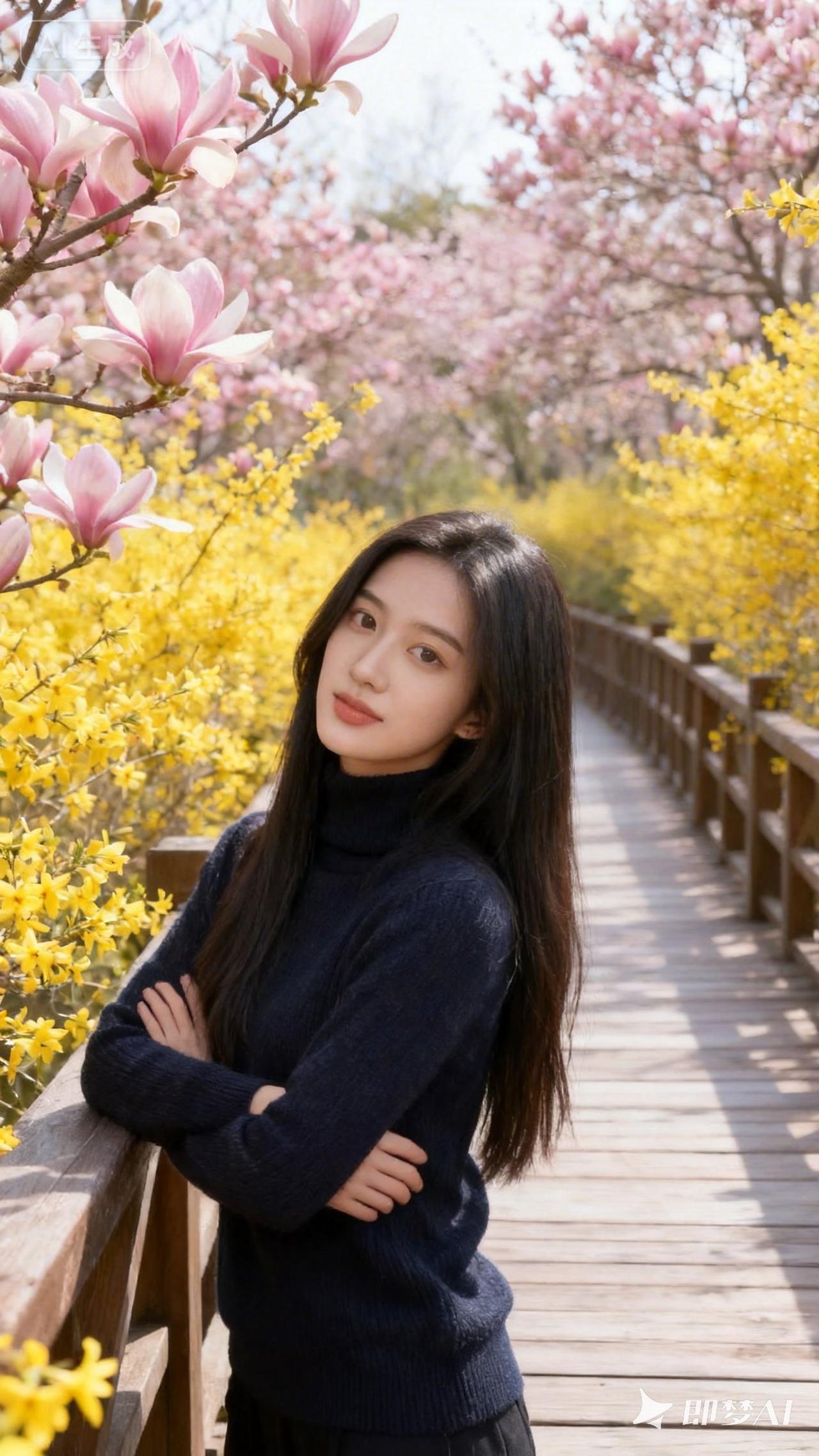春日漫步,花海中的少女,温暖阳光下的美好时光。