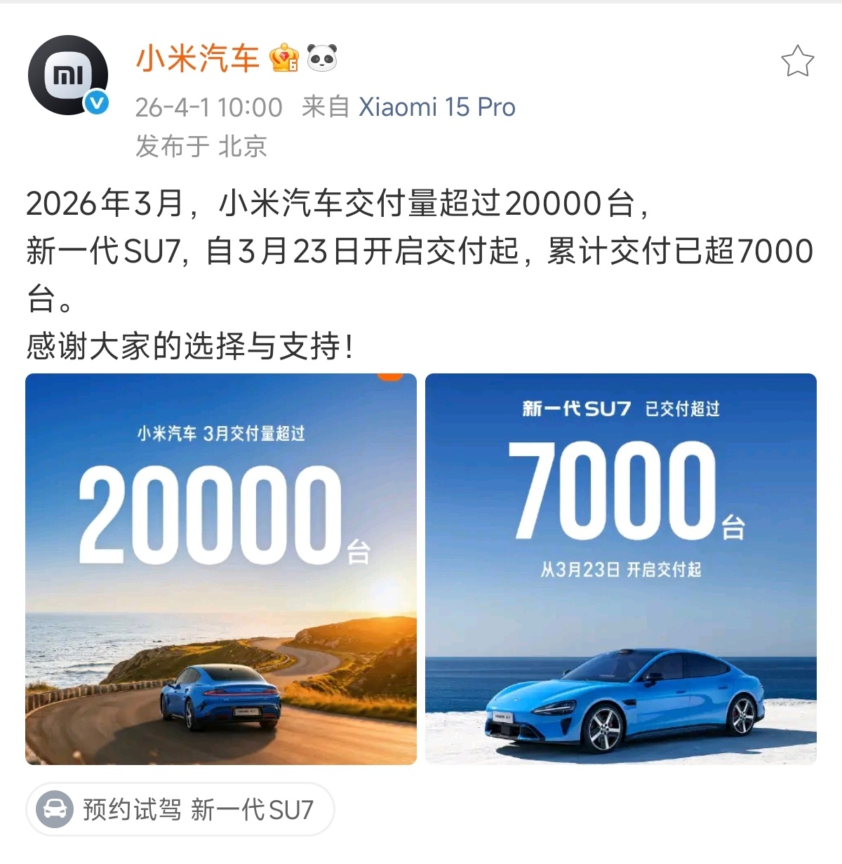 刚刚,小米汽车官博发了3月销量,速度真的快4月1日才上班,就完成了销量统计并发出