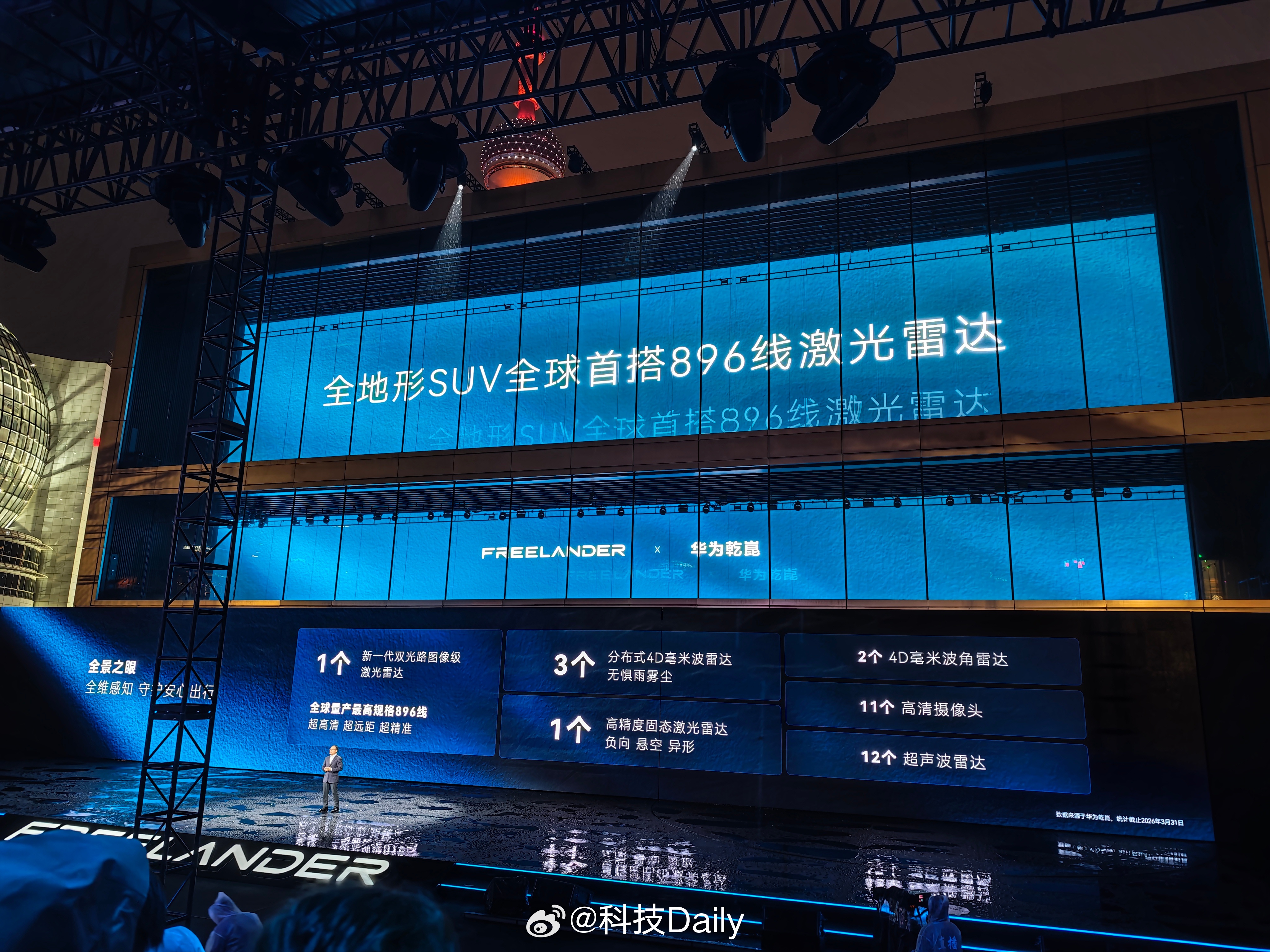 在这咱们再画个重点,FREELANDER神行者中国首发产品将全系标配华为乾崑智驾ADS V4.1版本,并可持续升级到下一代系统,中国最强辅助驾驶到位,华为896线激光雷达协同,这也是全球首个搭载896线激光雷达的全地形SUV。