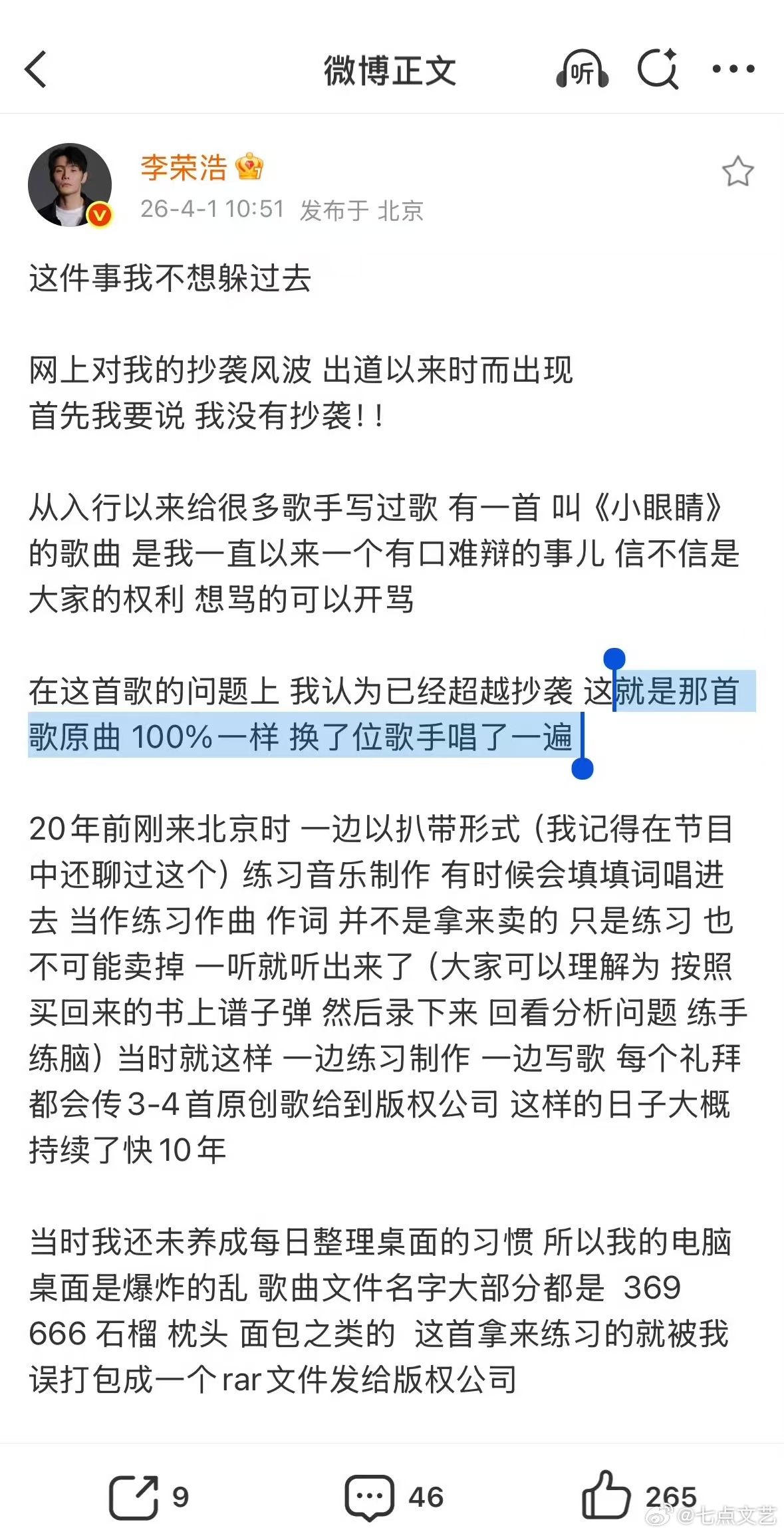 李荣浩眼睛小但不是心眼小如果真是他想写,要么不写,要么自己唱,怎么可能拱手让给别人还暗戳戳自嘲?逻辑根本说不通,他眼睛小但不是心眼小