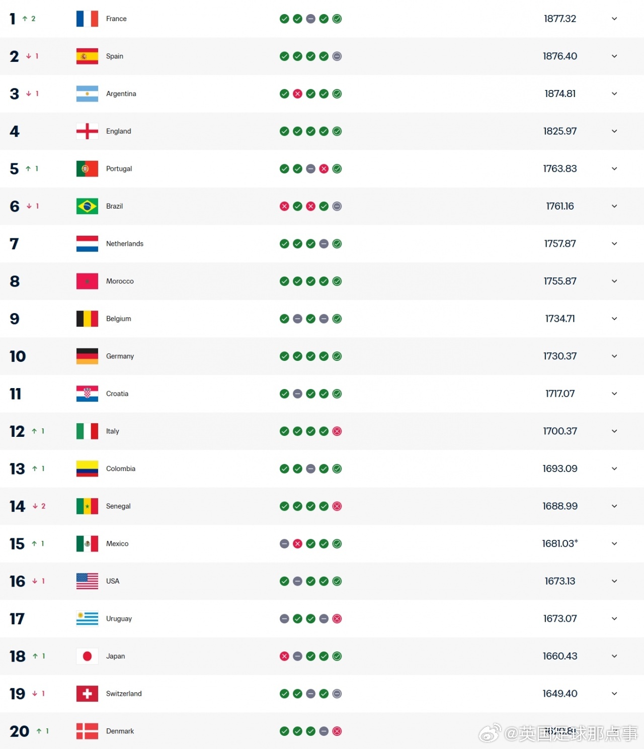 1. 法国(+2)2. 西班牙(-1)3. 阿根廷(-1)4. 英格兰5. 葡萄牙(+1)6. 巴西(-1)7. 荷兰8. 摩洛哥9. 比利时10. 德国11. 克罗地亚12. 意大利(+1)13. 哥伦比亚(+1)14. 塞内加尔(-2)15. 墨西哥(+1)16. 美国(-1)17. 乌拉圭18. 日本(+1)19. 瑞士(-1)20. 丹麦(+1)