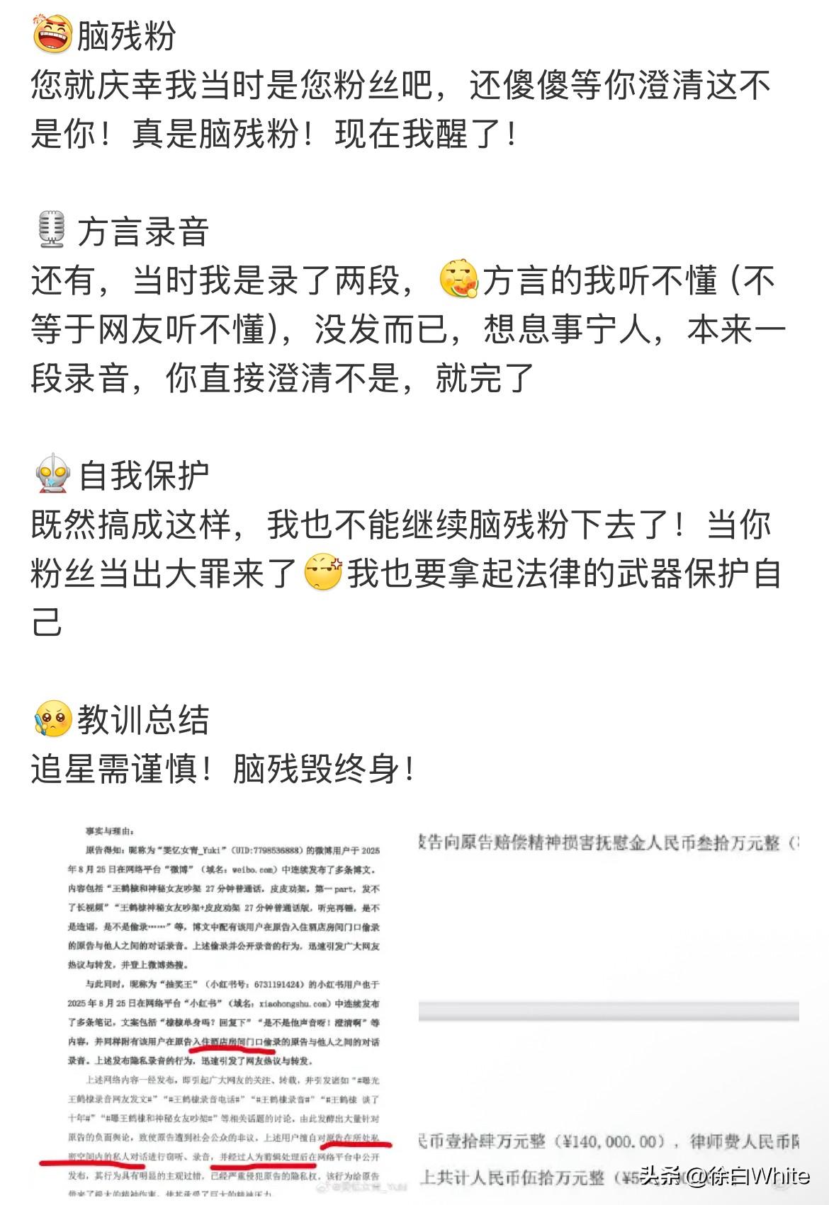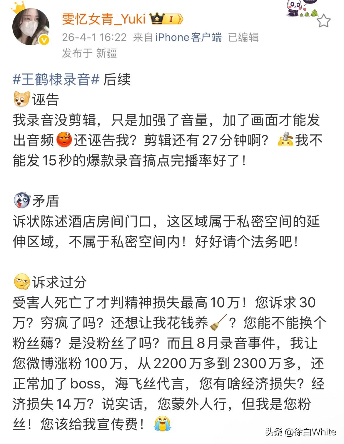 4月1日,王鹤棣酒店房门口录音事件后续 王鹤棣起诉了录音方索赔50w,录音方称王鹤棣诬告,直言录音没有剪辑,只是加强了音量,加了画面而已,认为酒店房门口不算区域而是公共区域,并控诉王鹤棣诉求太过分,赔偿金额太高了,表示自己手里还有一段录音,因为是方言本人听不懂所以没发,言外之意,王鹤棣执意索赔,她可能就发了,后面又说自己是王鹤棣的粉…… 事情是真的,毕竟有白纸黑字,只是具体情况还得等王鹤棣方给出回应才能判断!