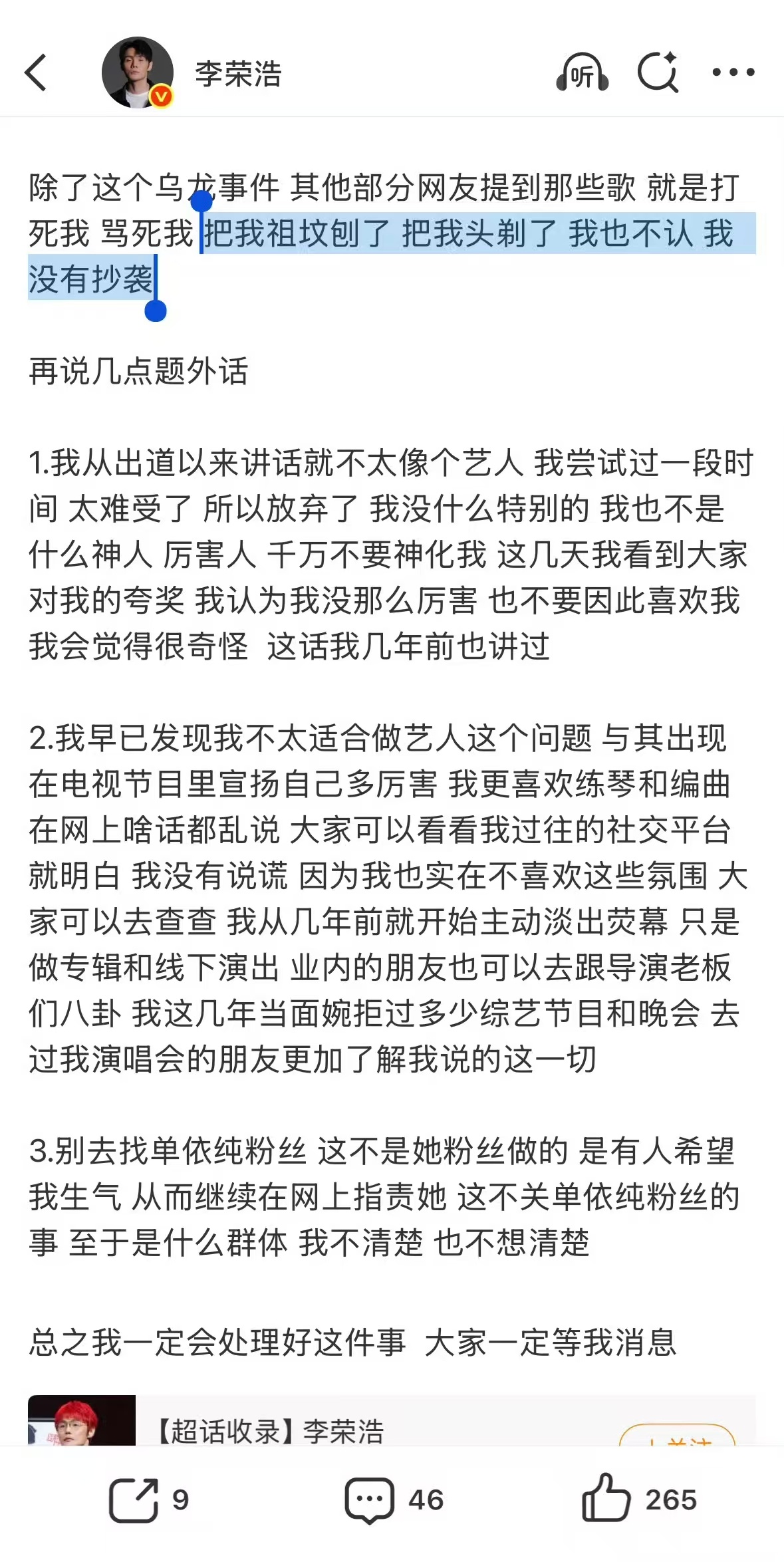 李荣浩眼睛小但不是心眼小如果真是他想写的歌,要么干脆不写,要么就自己演唱表明态度