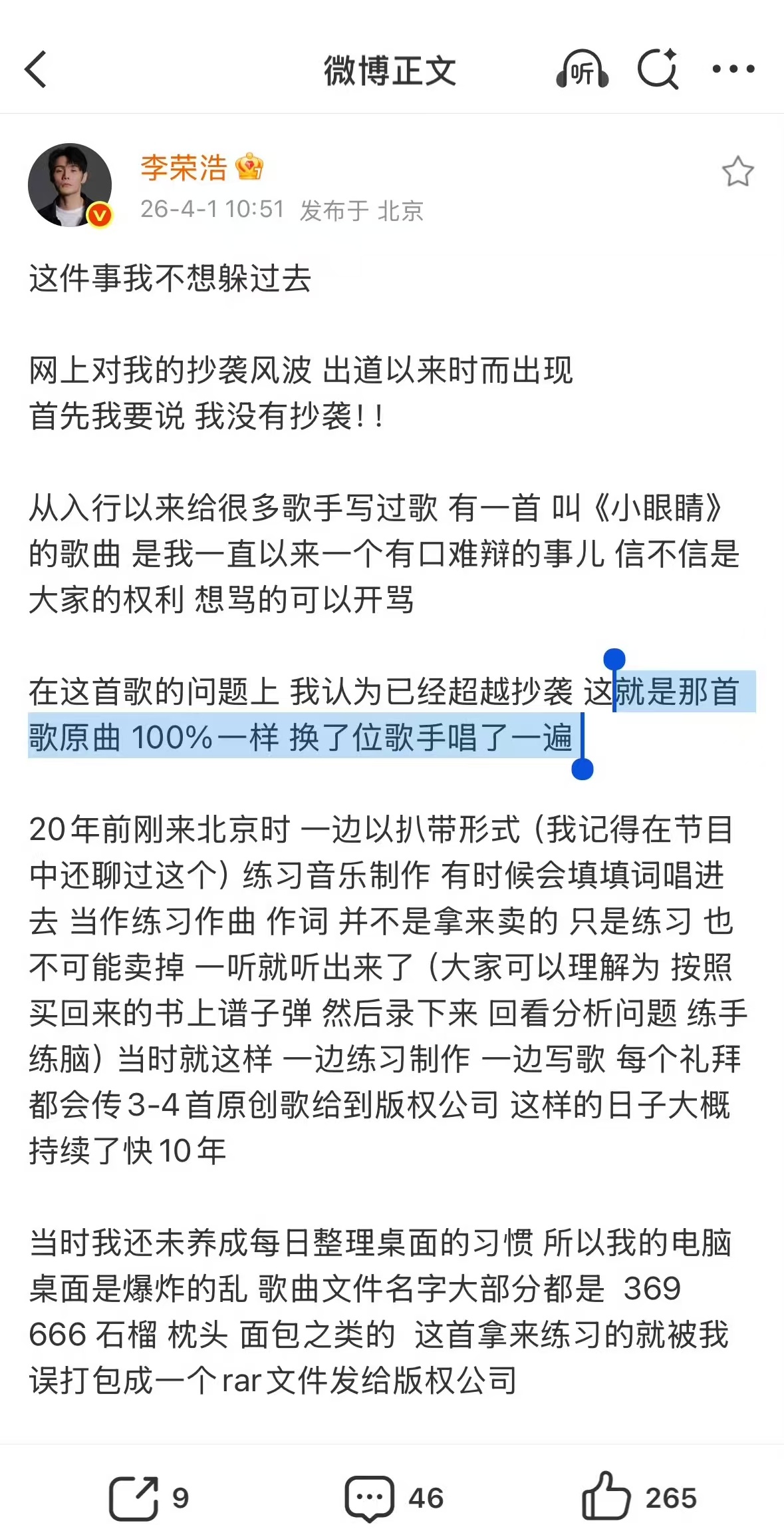 李荣浩眼睛小但不是心眼小如果真是他想写的歌,要么干脆不写,要么就自己演唱表明态度,根本不可能拱手让给别人还引来一身非议,逻辑上完全说不通,他眼睛小但不是心眼小,更不会做这种事