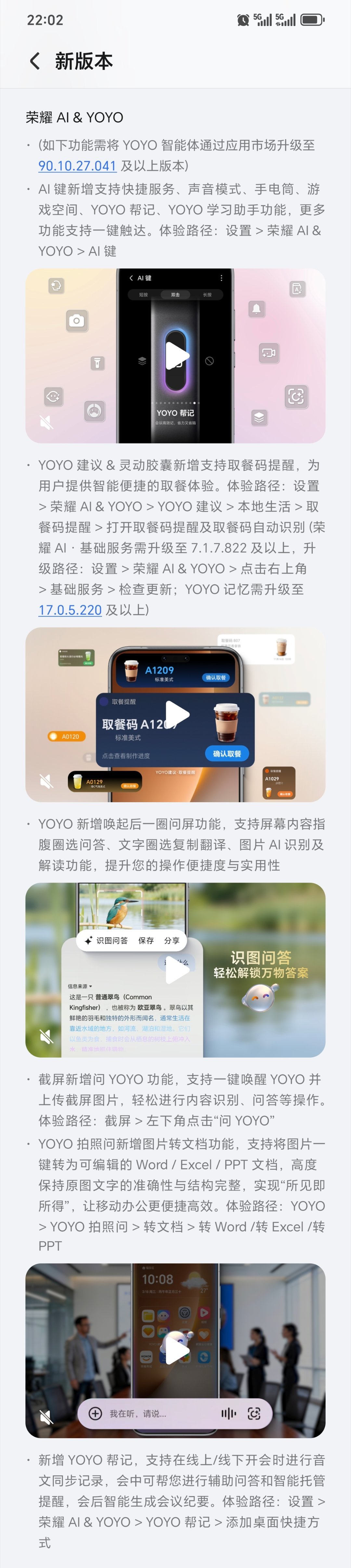 荣耀Magic8收到了MagicOS10150版本了。这次更新内容有点多,有1.13GB。主要10大更新你喜欢哪些功能?MagicOS月月新 一、荣耀AI&YOYO1,AI键新增支持快捷服务、声音模式、手电筒、游戏空间、YOYO帮记、YOYO学习助手功能,更多功能支持一键触达2,YOYO建议&灵动胶囊新增支持取餐码提醒3,YOYO新增唤起后一圈问屏功能,支持屏幕内容腹圈选问答、文字圈选复制翻译、图片AI识别及解读功能4,截屏新增问YOYO功能,支持一键唤醒YOYO并上传截屏图片,轻松进行内容识别、问答等5,YOYO拍照问新增图片转文档功能6,新增YOYO帮记,支持在线上/线下开会时进行音文同步记录,会中可帮您进行辅助问答和智能托管提醒,会后智能生成会议纪要二、系统流畅·新增应用过渡动效自定义功能,舒缓、平稳、高三档可选择