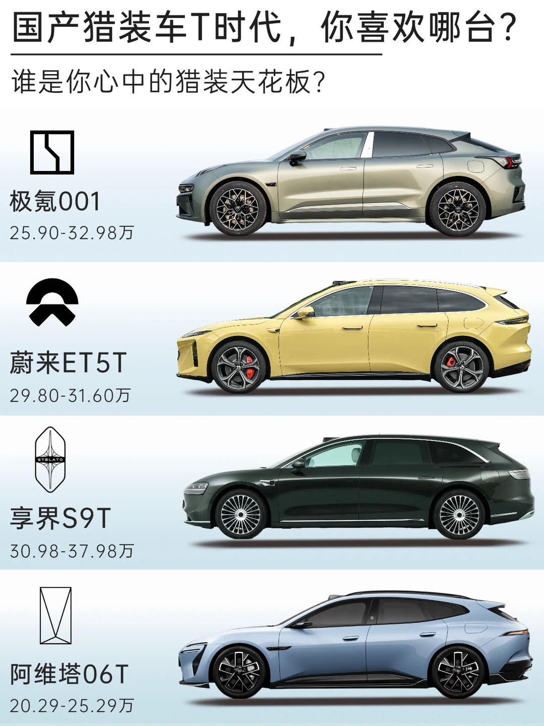 以前说到猎装车,很多人会想到小众情怀、进口溢价,想买台优雅溜背+大尾厢的猎装,可要花不少钱,但现在国产新能源直接把猎装车的价格打下来了!从20万级到30万+,从家用舒适到性能操控,能打的选手那是非常多,猎装终于从少数人的大玩具变成了普通人也能入手的优雅单品 极氪007GT、阿维塔06T、启境GT7、享界S9T 腾势Z9GT、尚界Z7T、极氪001、蔚来ET5T 你会怎么选?