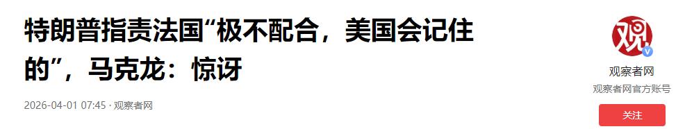 美法彻底翻脸,法国卡死以色列军援命脉! 导火索在3月31日。特朗普发文怒斥法国,指责马克龙政府在对伊军事行动中消极对抗,更直接切断了以色列的军援大动脉。 法国官方竟然禁止所有运载军用物资飞往以色列的航班飞越其领空。 面对华盛顿的怒火,法国爱丽舍宫表示“很惊讶”,声称这项政策自中东冲突爆发以来就没变过。法国军方也出面解释,美军执行后勤任务的非作战飞机依然可以借道法国空军基地。 禁令针对的仅仅是向以色列输送“进攻性军事物资”的航班。这番话看似讲道理,实则是在给美国的单边行动划底线。要看懂这场盟友间的内讧,就得看清背后的地缘博弈。 美国正牵头对伊朗动武,妄图用拳头压服德黑兰巩固中东霸权。华盛顿想拉欧洲盟友下水分摊风险。但马克龙早就看透了这套把戏,多次警告美以动武缺乏安理会授权且违背国际法。 以色列的军事补给高度依赖海外运输。欧洲领空尤其是法国,正是美国军援的核心通道。法国扼守空中要道,收紧领空管控实质上掐断了以色列获取进攻性武器的关键命脉。 美国现在的处境骑虎难下。对伊军事行动持续一月未能速战速决,反而导致霍尔木兹海峡近乎关闭。全球能源供应链受创,美国国内通胀飙升,特朗普急需欧洲盟友出钱出力。 法国的强硬并非孤立事件。西班牙也对参与军事行动的飞机关闭领空,德国同样明确表态绝不参与海湾油轮护航。这反映了欧洲内部正在发生深刻的战略觉醒。 欧洲人意识到,美国的中东战略只服务于自身霸权。一旦战火蔓延,高度依赖中东能源的欧洲将首当其冲吞下通胀苦果。法国作为欧盟核心,正拼命推动欧洲战略自主,不愿再做附庸。 最难受的当属以色列。战事消耗巨大却被法国拒之门外,传言以色列已决定停止从法国采购军事物资。但敢顶着压力全力支援以色列的国家寥寥无几,其传统的西方支持圈正加速瓦解。 美欧在中东战略上的根本分歧已无法掩盖。特朗普的“记仇”言论更多是极限施压,北约框架下双方依然有利益绑定。但美国主导的西方联盟内部利益分歧正在无限放大。 美国的冒险政策引发地区动荡,直接危及欧洲核心利益,必然激起强烈反弹。法国的硬核操作再次印证了残酷的铁律:没有永恒的盟友,只有永恒的利益。 美国试图用霸权逻辑裹挟盟友的做法,正遭到越来越强烈的反噬。单极主导的时代面临着前所未有的挑战。