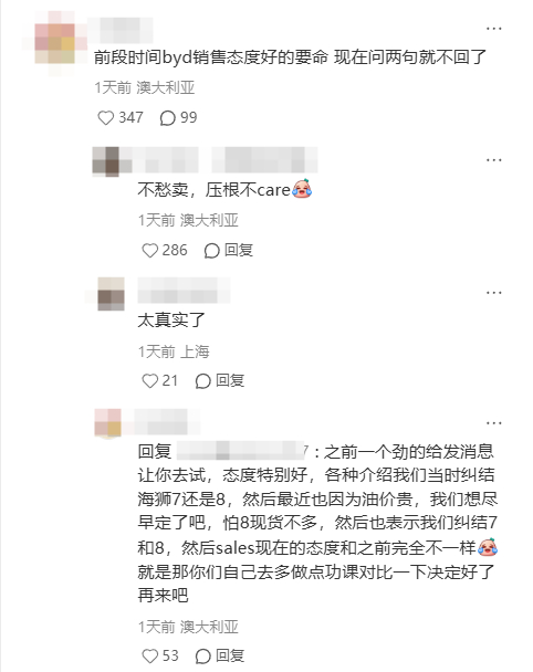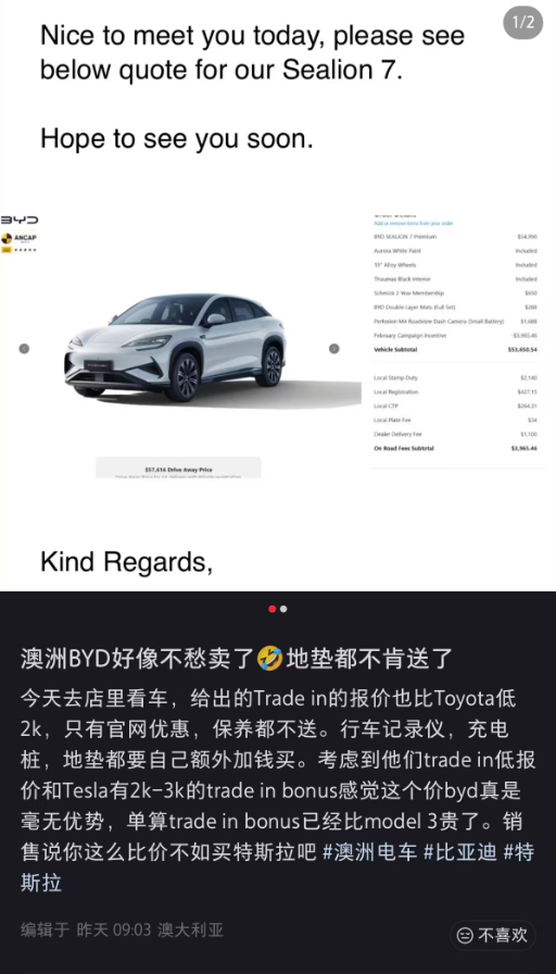 【当初你对我爱搭不理,现在我叫你高攀不起】中国电车澳洲行情太火爆,比亚迪销售奉劝新客:“实在不行咱要不还是去买特斯拉吧。”“今天去店里看车,给出的置换报价也只比丰田低2000,只有官网优惠,连保养都不送。行车记录仪、充电桩、地垫都要自己额外加钱买。考虑到他们置换报价低,而特斯拉有2000到3000的置换补贴,感觉这个价格比亚迪真是毫无优势,单算置换补贴已经比特斯拉Model 3贵了。结果销售说:‘你这么比价不如去买特斯拉吧’。”我在开头给大家复述的这段话,是我最近在小地瓜上刷到的一条帖子。贴主是一位IP定位在澳大利亚的网民,他最近想入手一台新车,于是本着货比三家的心态,分别去丰田、比亚迪和三家都打听了一下。结果出乎意料的是,原本服务最热情也最好说话的比亚迪销售,这次反而是三个品牌里态度最“冷淡”的,不仅置换报价没什么吸引力,而且买车啥也不送,你多和他掰扯两句,对方干脆当场给特斯拉引流带货。搞得人竟一时不知,这销售到底是姓B的还是姓T的。不光这位网民,很多IP同样定位在澳大利亚的网民也纷纷出来现身说法,表示:“迪子你变了,变得好陌生,变成我高攀不起的样子了。”“真的,前段时间比亚迪的销售态度好得要命,现在问两句就不回了。”“没办法,不愁卖,压根不care。”“之前一个劲地给发消息让你去试,态度特别好,各种介绍我们当时纠结海狮7还是8,然后最近也因为油价贵,我们想尽早定了吧,怕8现货不多,然后也表示我们纠结7和8,然后销售现在的态度和之前完全不一样。张口就是:‘那你们自己去多做点功课,对比一下,决定好了再来吧’。”“笑死,我今天去试驾,然后对方给的报价也差不多,给我一种‘爱买不买,反正别人会买’的感觉。”“嗯啊,现在如果你问一句:‘有什么送吗’?比亚迪的销售只会送你一个大白眼。”“比亚迪去年试驾还给奶茶喝,现在想都不敢想。”“你以为想买就能买得到吗?现在要等三个月才能买得到啊。”那么问题来了,为什么曾经笑面如花的比亚迪澳洲销售,现在变得如此拒当地消费者于千里之外,以至于让人产生了一种高攀不起的即视感了呢?原因很简单:美以入侵伊朗,整个中东都乱成了一锅粥。伊朗迫于自卫发动无差别袭击,最后索性把霍尔木兹海峡也给封了。澳大利亚的原油进口高度依赖中东,霍尔木兹海峡这一堵,直接把澳洲的油价给挤到了天上。在澳洲生活,出门没车是万万不行的,但是现在油价那么贵,天天开油车又不现实。那怎么办呢?可不就只好买电车了呗。【机会只留给有准备的人】澳洲的电车品牌当然不止比亚迪一个,但是电车和电车是不一样的。澳洲不是中国,比亚迪和特斯拉对当地人来说都是外国车,他们的外国滤镜没那么强。而一旦失去了外国滤镜,特斯拉在比亚迪面前的处境那就是懂得都懂了。现在澳洲汽车市场上的情况是:比亚迪不仅在新能源赛道上对昔日的霸主特斯拉形成了压制优势,甚至连统治了大洋洲汽车市场20余年的绝对王者丰田的老大地位都受到了动摇。回顾2025年,那时的特斯拉在澳洲车市上依然保有一丝傲骨。凭借Model Y的单品爆发力,特斯拉勉强守住了纯电车的年度销量桂冠。但在盛名之外,比亚迪的合围之势已经成型。整个2025年,比亚迪在澳洲的新能源全品类,包含纯电与混动,交付量已经突破了5.2万辆大关,这一数字几乎是特斯拉同期的两倍。而到了2026年一季度,量变更是彻底引发了质变。仅今年1月,比亚迪的单月销量同比就飙升了超过600%,突破月销5000辆的关口。在纯电汽车市场上,比亚迪一口气吞下了近四成的份额,与特斯拉的销量对比甚至一度拉大到了惊人的10:1。尽管在随后的2月份,特斯拉依靠降价和交付节奏的回调,勉强稳住了单月销冠,但比亚迪已经实现了多款车型霸榜销量前五的壮举。为什么?为什么特斯拉会在短短一年内被迅速逼平甚至反超?答案就在于比亚迪产品矩阵的丰富度与受众面。特斯拉的车型选择向来比较有限,而且受制于老旧的产品线和高昂的单车售价,其在下沉市场和多元化需求面前早就显得力不从心了。反观比亚迪,不仅在3万澳元以下的入门级市场投放了极具性价比的代步车型,还在中型SUV和最受澳洲人欢迎的皮卡市场布下了重兵。这种“多生孩子好打架”的全方位覆盖,让比亚迪在家庭增购、城市通勤以及商用宽体车等各个细分领域,都精准截流了特斯拉的潜在客群。此外,由于中东地缘冲突导致原油供应链受阻,澳大利亚和新西兰的燃油价格正在经历一轮新的猛涨。以新西兰为例,该国的汽油零售价格,在短短几周之内就飙升了大约20%,突破了每升3新西兰元的历史高位。对于高度依赖汽车出行的澳新两国居民来说,暴增的出行成本,成了压垮他们燃油车信仰的最后一根稻草。受此影响,当地消费者开始纷纷用钱包投票。据不完全统计,仅在3月份一个普普通通的周六,新西兰当地的比亚迪门店单日就卖出了近百台新车,这是过往平均销量的6倍之多。澳洲经销商的反馈同样热烈,展厅客流激增,插混和纯电车型的试驾排期被彻底排满。抖上有位在澳洲干比亚迪销售华人,3月没过完销量就破百了,现在他说自己根本高兴不起来,因为签单不是问题,等到交车的时候麻烦才大。这种由于外部危机引发的能源恐慌,完美契合了比亚迪的营销叙事。当地消费者不再仅仅是为了虚无缥缈的环保理念