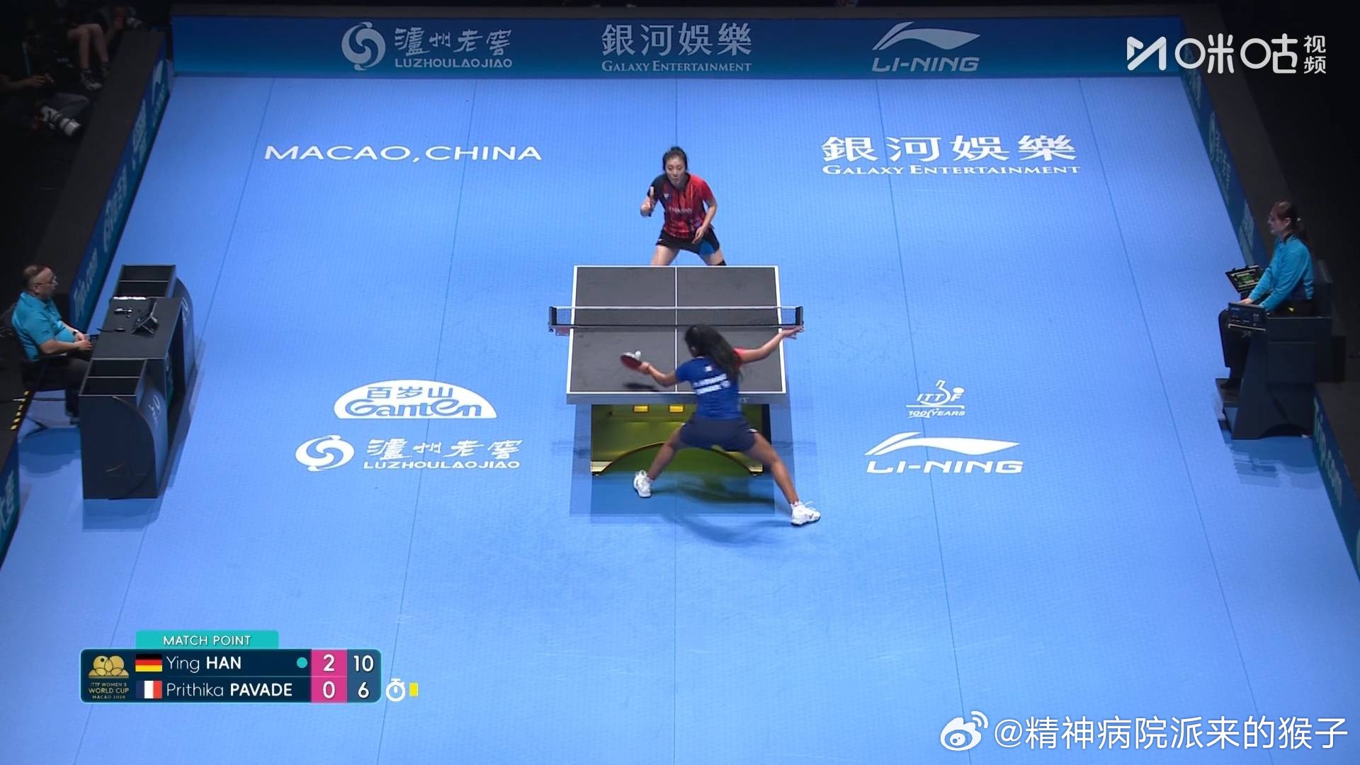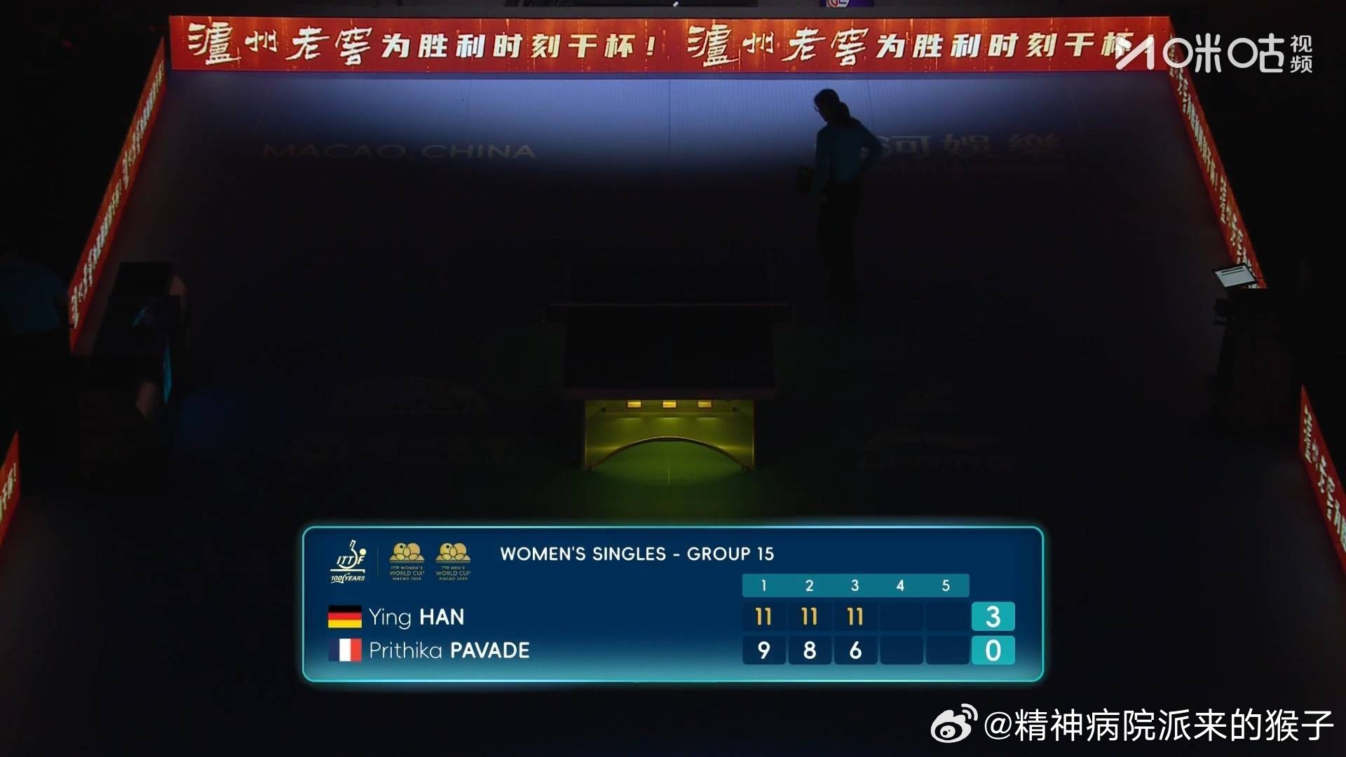 韩莹3比0帕瓦德(9,8,6)2026年澳门乒乓球世界杯女单小组赛第15组韩莹两战全胜出线