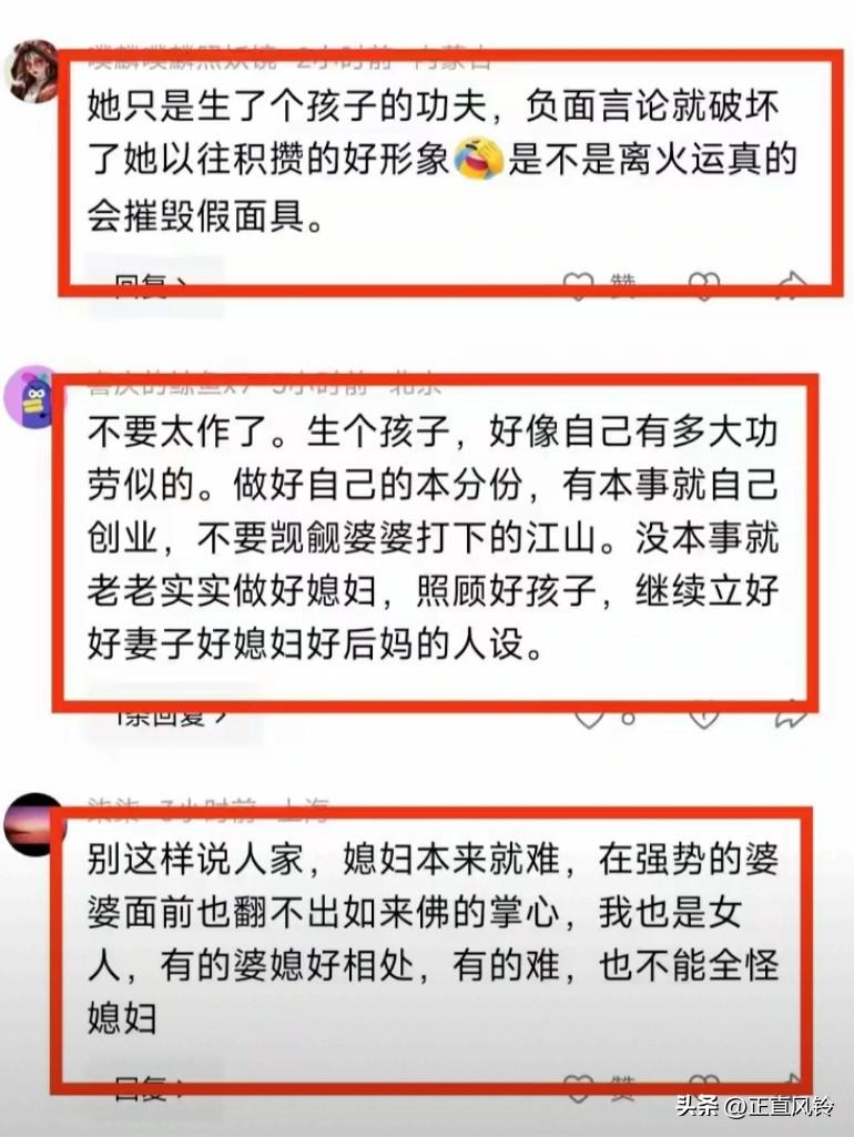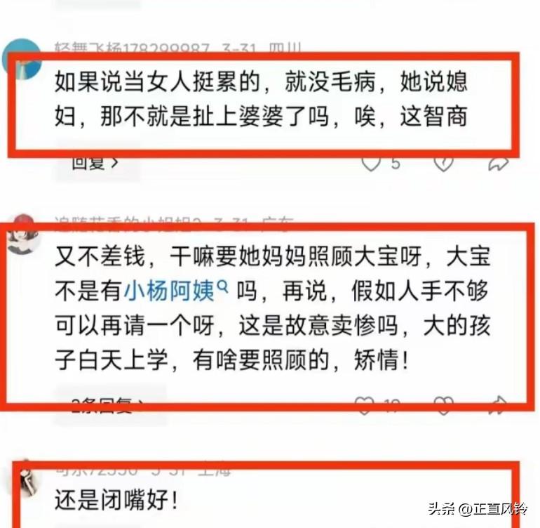 马筱梅说她觉得自己的妈妈太累了,又要顾自己家,还要照顾三个孩子,不是有保姆吗? 这不是内涵婆婆吗?别忘了她是离过婚的,她为什么离婚没有原因吗?反正是挺奇怪,小杨阿姨自己做这些活的时候也没说累,也没说自己做不了啊,马筱梅妈妈何必来受这份累。 让月月,林林去北京找奶奶,小扬阿姨也跟着回来,你小梅愿意在湾湾,就和你爸妈住即减轻你们的负担也让兰姐她们祖孙团聚。 生了个儿子,把自己抬得上天了,一共40多天,整多少事,就怕你生了二个儿子就现在这样都养不起,不回大陆,继续留在湾湾,将来不愁不帮妈采茶,到处做医美。 晓梅你只想当婆婆,你以为当婆婆这么好当啊?你婆婆就一个宝贝儿子,她出身、情商、智商、能力、金钱哪一样都甩你几条街,为了当好婆婆,她付出了百分百努力,结果怎么样?被前夫鄙视,被儿子骂,被儿媳戏弄,如果换作是你,你又怎么想?怎么做?你还想当婆婆吗?