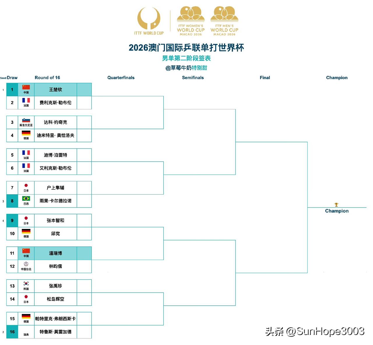 澳门世界杯第二阶段签位表,孙颖莎和蒯曼首轮内战 小组赛结束,晋级到决赛的16位选手, 重新抽签,这一次都是强者,谁都不好打。 莎莎蒯曼首轮内战,第一场比赛就遇到了, 在上半区的还有覃予萱和王艺迪, 对手分别是温特和张本美和。 下半区陈幸同和王曼昱,对手也都比较熟悉, 伊藤美诚,还有俩削球, 对于国乒选手都没啥威胁。 王楚钦首轮小布,温瑞博在下半区,首轮林昀儒。 遇谁打谁吧, 做好困难准备,一起加油!