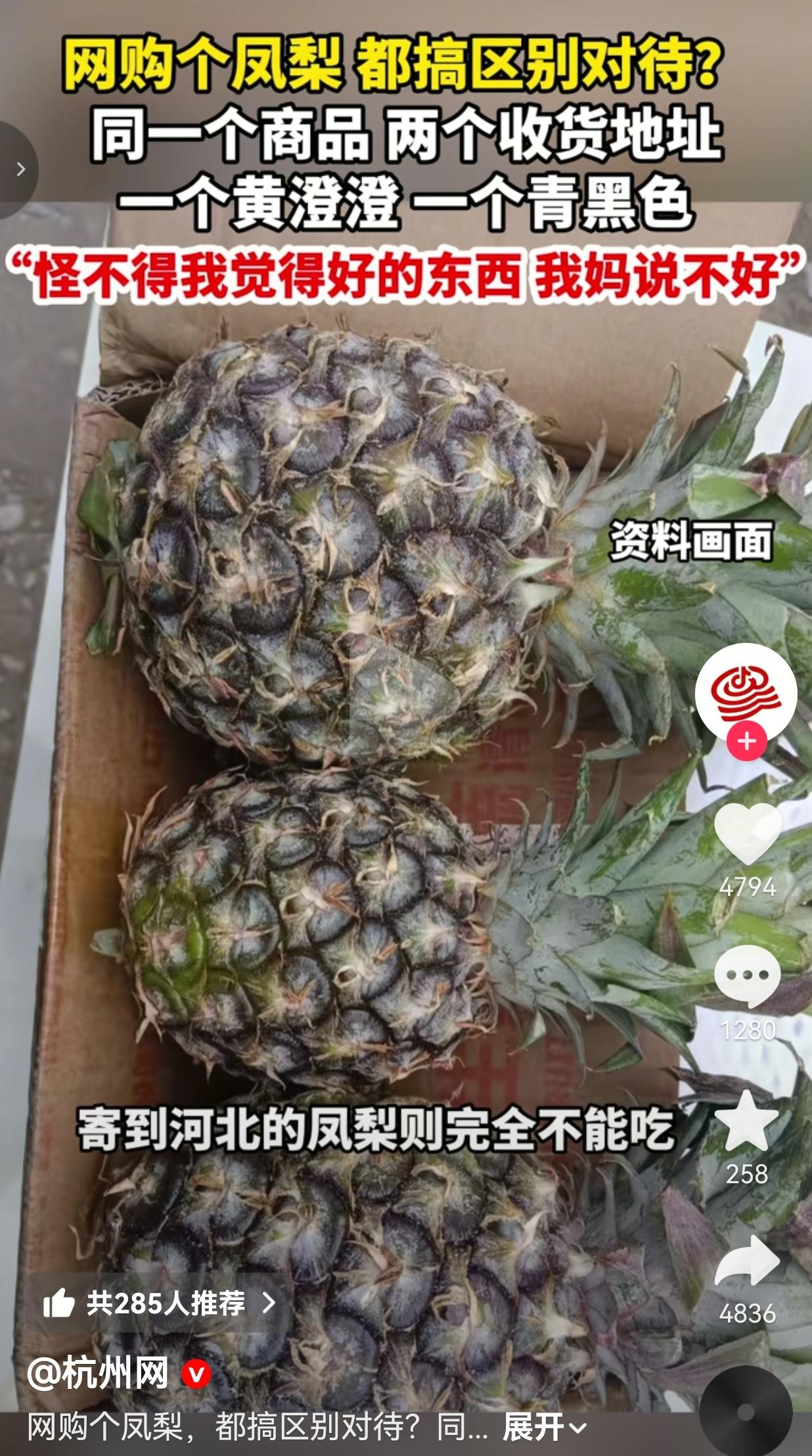 气死人了!现在网购个凤梨,商家都敢明目张胆搞区别对待了!同一个链接、同一款商品,寄到北京的个个黄澄澄甜到齁,寄到河北农村的全是青黑烂果,根本没法吃! 难怪我每次给我妈买好东西,她总说不好吃,原来根本不是我妈挑剔,是商家把最差的货全发给了老家! 北京一姑娘,在网上同一家店、同一个链接,同时下了两单凤梨。 一单寄到自己北京的家里,另一单寄回河北农村老家,给爸妈尝尝鲜。 结果呢? 姑娘收到北京的货,一开箱直接乐了:两个凤梨个个金黄饱满,果眼饱满,看着就新鲜,切开一尝,甜汁直接爆出来,那叫一个好吃! 可等她妈把河北收到的货拍给她看,姑娘当场就炸了! 寄到河北的那箱,全是青黑色、硬邦邦的烂果子,表皮发黑发蔫,看着就像放了半个月的坏果。 她妈妈切开尝了一个,直接吐了:“这啥玩意儿?水咕咕的,一点味儿都没有,根本没法吃!” 姑娘瞬间就明白了:合着商家是看地点下菜碟啊! 知道北京是一线城市,消费者维权意识强,就发好货;知道河北农村是小地方,老人不懂维权、怕麻烦,就把卖不出去的烂果子、生果子,一股脑全发过去了! 这不就是赤裸裸的地域歧视吗?这不就是欺负老实人吗?姑娘越想越气,直接把两箱凤梨的对比图拍下来,发到了网上,质问商家:“凭什么同一个商品,两个地址两个待遇?我们河北农村人就不配吃好果子?” 更戳人的是什么?姑娘说,以前她也总给妈妈买东西,每次自己收到的都好好的,妈妈收到的却总说不好吃,她还一直怀疑是妈妈太挑剔,根本没敢往商家故意挑货上想!直到这次两单同时下单,才彻底戳穿了商家的黑心套路。 网友看到后评论说:太真实了!我每次给我老家爸妈买东西,收到的全是残次品!我自己在北京收到的就好好的!我还一直纳闷呢,合着商家是故意的! 也有的网友说:这不是地域歧视是什么?就欺负农村人不懂法、不会闹!真的太恶心了!以后谁还敢给老家买东西? 还有的网友说:我真的破防了!每次给爸妈买好吃的,他们总说“不好吃、别乱花钱”,我还以为是他们舍不得,原来根本是商家发的就是烂货!难怪我妈总说不好! 更有的网友说:太气人了!我们河北农村人怎么了?就该吃烂果子?商家是不是觉得我们不会投诉、不会维权?真的太欺负人了! 说实话,这哪里是发错货?这根本就是商家精心设计的套路! 他们心里门儿清:一线城市的消费者,懂维权、会投诉,一个差评、一个投诉,就能让他们店铺扣分、罚款,所以不敢发坏货。 可农村的老人呢?一辈子省吃俭用,收到坏果子,第一反应不是找商家维权,而是“算了,别麻烦了,扔了就扔了”,就算找过去,商家也能随便找个理由搪塞,反正老人不懂平台规则,闹不起来! 就因为这个,商家就敢把最差的货、最烂的果,全发给农村的消费者!这哪是正经做生意,简直就是欺负人、耍套路! 更让我难受的是什么? 多少在外打拼的年轻人,省吃俭用给老家的爸妈买好吃的、买好东西,满心欢喜等着爸妈夸一句“好吃”,结果爸妈收到的全是商家发的残次品、烂果子,他们怕孩子心疼,只能说“不好吃、别买了”,我们还傻乎乎以为是爸妈口味不一样、太挑剔,根本没敢怀疑是被商家挑了货! 原来我们的孝心,全被这些无良商家当成了赚钱的工具! 我们想给爸妈的爱,全被这些黑心商家给糟蹋了! 我就想问这些无良商家一句:你们没有爸妈吗?你们不给老家的亲人买东西吗?如果有人给你爸妈发这种烂果子,你是什么心情?己所不欲,勿施于人,这个道理很难懂吗? 职业没有高低,地域更没有贵贱!北京人配吃好凤梨,河北农村人就不配?消费者的权益,从来不是按城市大小划分的! 不管你是一线城市,还是偏远农村,只要你花了钱,就该拿到同等质量的商品!这是最基本的底线! 这件事,从来都不是一个凤梨的问题。它戳破了电商行业最肮脏的遮羞布:地域歧视式发货。 多少商家,靠着这套“看人下菜碟”的套路,赚着黑心钱,坑着无数给父母尽孝的年轻人,坑着无数不懂维权的农村老人。 我们愤怒,不是因为一个烂凤梨,而是因为我们的孝心被践踏,我们的权益被漠视,我们的家乡被歧视! 我们愤怒,是因为我们不想再让爸妈收到烂果子,不想再让我们的爱,变成商家眼里的笑话! 电商不是法外之地,消费者的权益,更不是可以随意践踏的! 别再拿“发错货”当借口,别再拿“运输问题”当挡箭牌!同一个链接、同一批货,两个地址天差地别,谁都不是傻子! 我就想告诉所有无良商家:别欺负老实人,别歧视农村人!你今天敢给河北农村发烂果子,明天就敢给全国的小地方发烂货!消费者的眼睛是雪亮的,你敢搞区别对待,我们就敢让你彻底凉凉! 别让你的孝心,死在无良商家的地域歧视里!花一样的钱,就该拿一样的货!农村人,也配吃最好的! 对此,你怎么看? 信息来源:杭州网