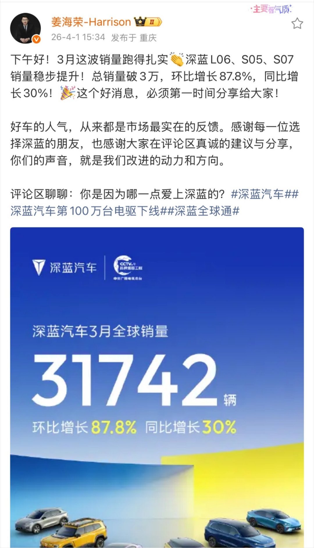 深蓝汽车公布3月全球销量破3万又到了各家车企秀肌肉的时候了,深蓝这边表现还是很不错的,3月全球销量31742辆,环比增长87.8%,同比增长30%